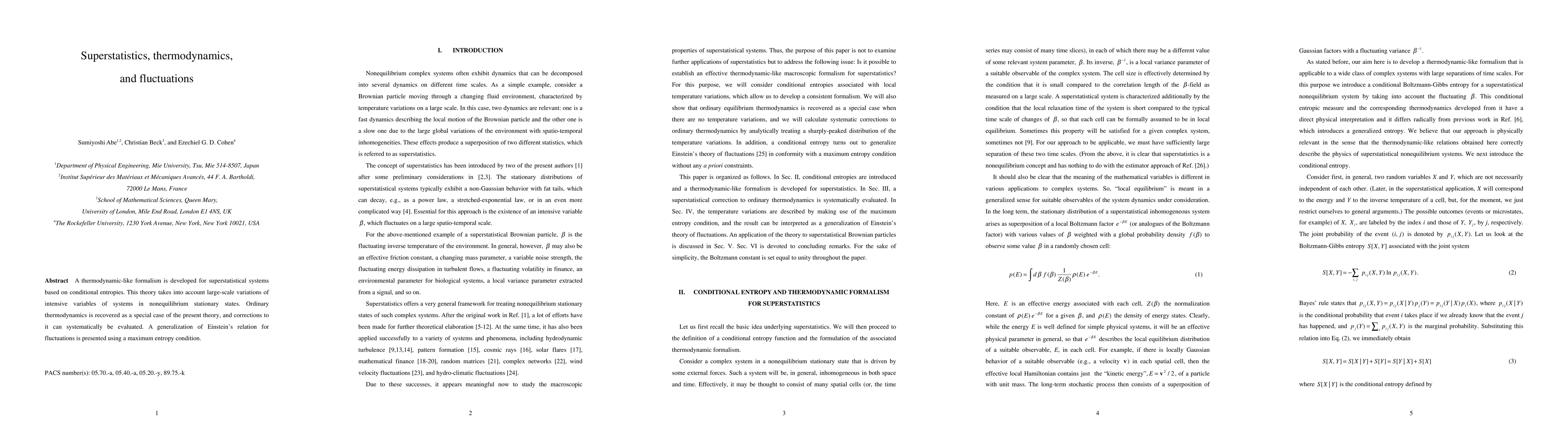 A thermodynamic-like formalism is developed for superstatistical systems based on conditional entropies. This theory takes into account large-scale variations of intensive variables of systems in nonequilibrium stationary states. Ordinary thermodynamics is recovered as a special case of the present theory, and corrections to it can be systematically evaluated. A generalization of Einstein's relation for fluctuations is presented using a maximum entropy condition.