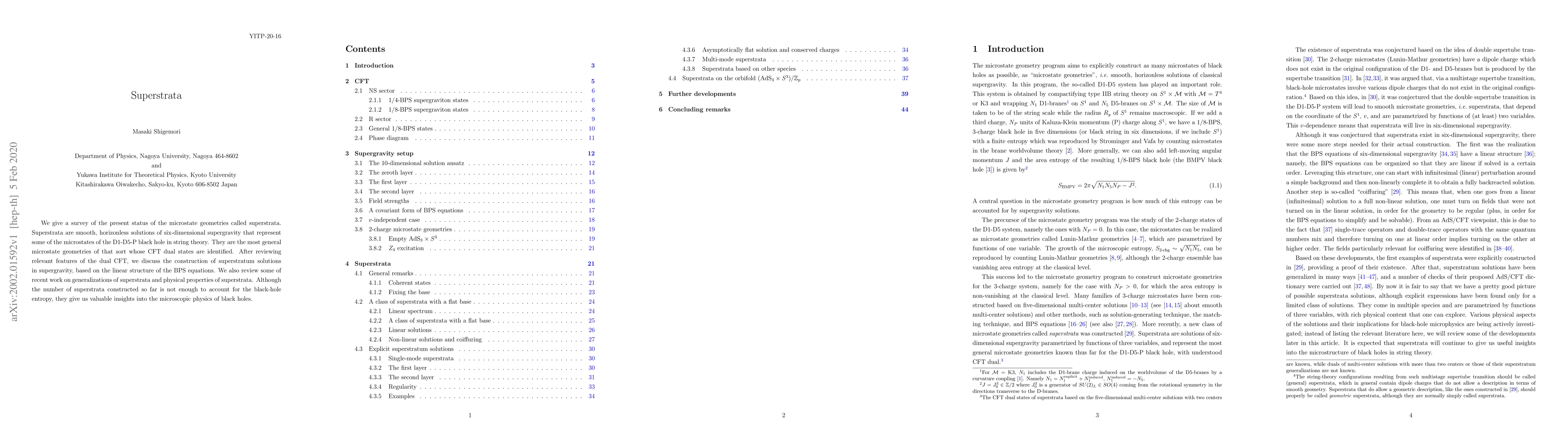 We give a survey of the present status of the microstate geometries called superstrata. Superstrata are smooth, horizonless solutions of six-dimensional supergravity that represent some of the microstates of the D1-D5-P black hole in string theory. They are the most general microstate geometries of that sort whose CFT dual states are identified. After reviewing relevant features of the dual CFT, we discuss the construction of superstratum solutions in supergravity, based on the linear structure of the BPS equations. We also review some of recent work on generalizations of superstrata and physical properties of superstrata. Although the number of superstrata constructed so far is not enough to account for the black-hole entropy, they give us valuable insights into the microscopic physics of black holes.
