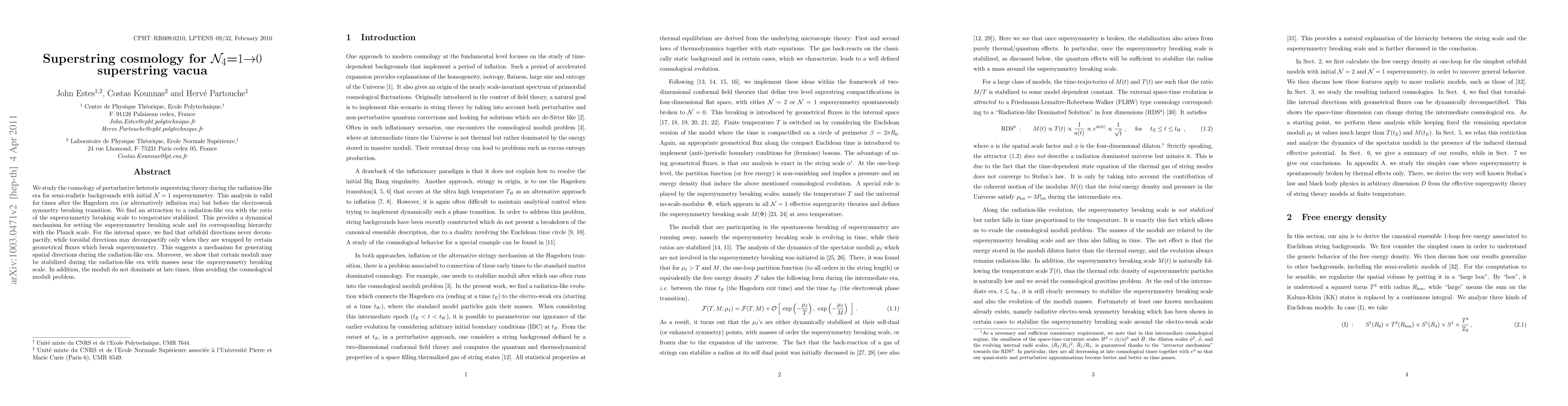 We study the cosmology of perturbative heterotic superstring theory during the radiation-like era for semi-realistic backgrounds with initial $\N=1$ supersymmetry. This analysis is valid for times after the Hagedorn era (or alternatively inflation era) but before the electroweak symmetry breaking transition. We find an attraction to a radiation-like era with the ratio of the supersymmetry breaking scale to temperature stabilized. This provides a dynamical mechanism for setting the supersymmetry breaking scale and its corresponding hierarchy with the Planck scale. For the internal space, we find that orbifold directions never decompactify, while toroidal directions may decompactify only when they are wrapped by certain geometrical fluxes which break supersymmetry. This suggests a mechanism for generating spatial directions during the radiation-like era. Moreover, we show that certain moduli may be stabilized during the radiation-like era with masses near the supersymmetry breaking scale. In addition, the moduli do not dominate at late times, thus avoiding the cosmological moduli problem.