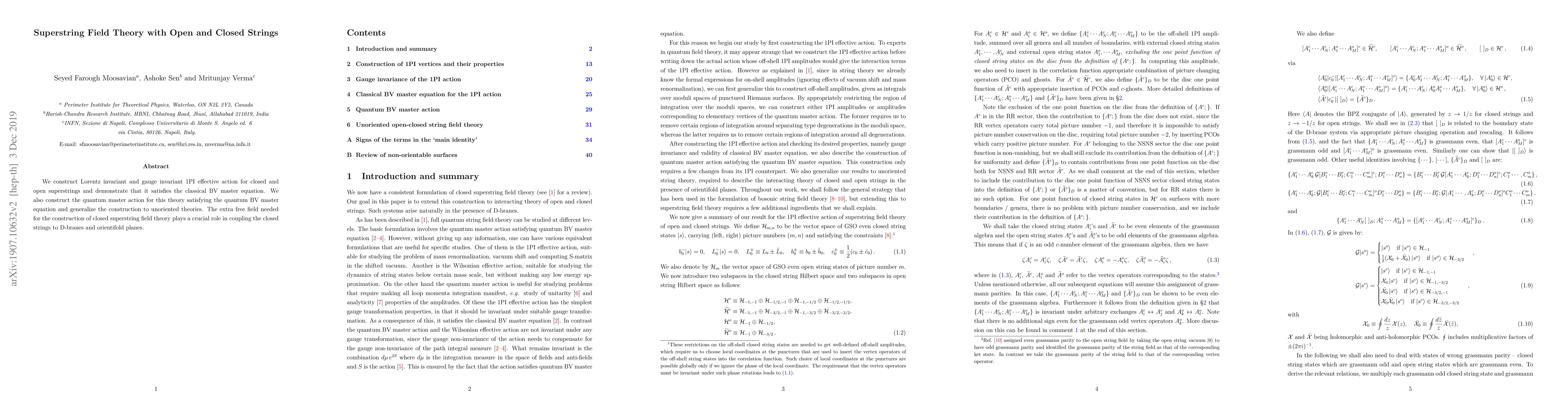 This paper constructs a Lorentz and gauge invariant effective action for both open and closed superstrings, showing compliance with the classical BV master equation. It extends the framework to quantum levels and unoriented theories, highlighting the importance of an additional free field in coupling closed strings to D-branes and orientifold planes.