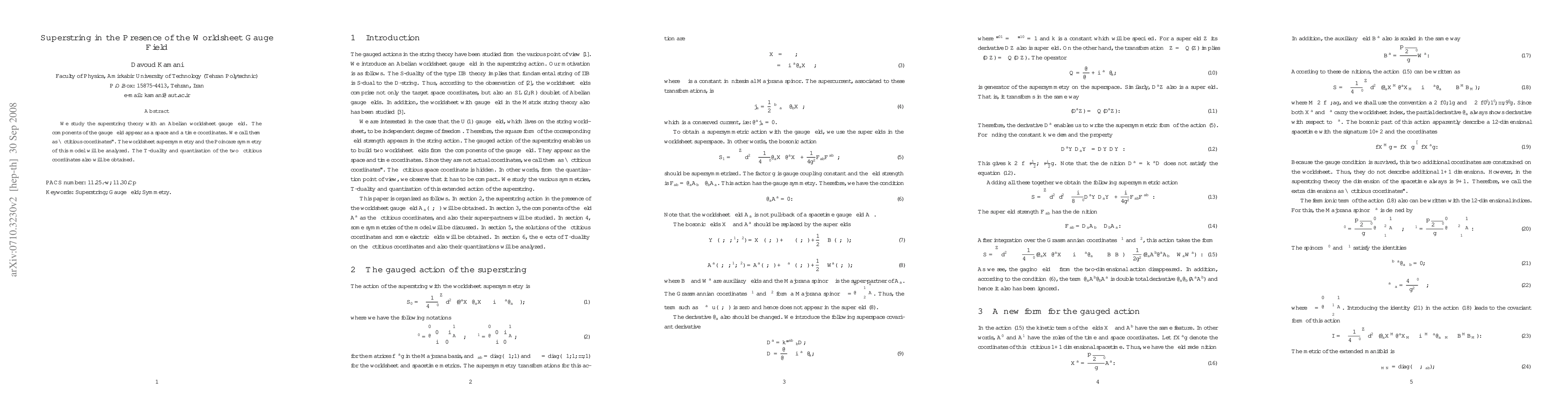 This paper investigates superstring theory incorporating an Abelian worldsheet gauge field, treating its components as fictitious coordinates. It analyzes worldsheet supersymmetry, Poincaré symmetry, $T$-duality, and the quantization of these fictitious coordinates.