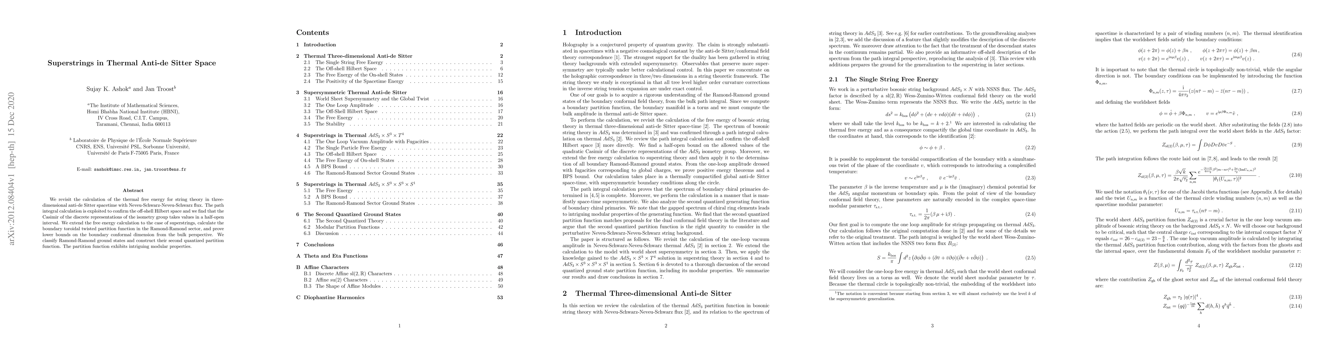 This paper calculates the thermal free energy for superstrings in 3D anti-de Sitter spacetime with NS-NS flux, confirming off-shell Hilbert space and deriving the Casimir values for discrete representations. It also constructs the boundary toroidal twisted partition function for the Ramond-Ramond sector and proves lower bounds on boundary conformal dimensions.