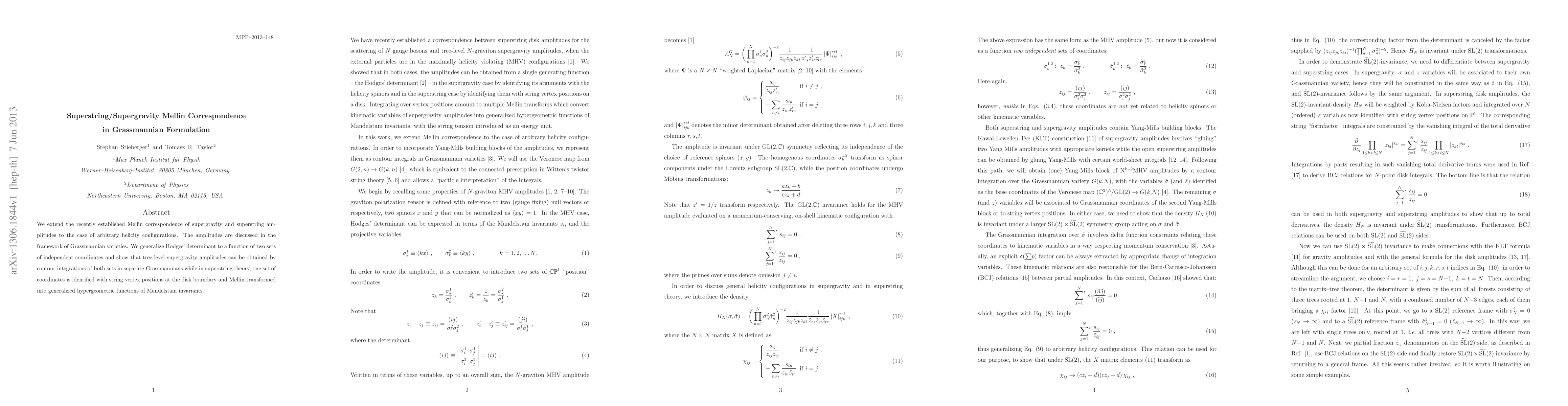 We extend the recently established Mellin correspondence of supergravity and superstring amplitudes to the case of arbitrary helicity configurations. The amplitudes are discussed in the framework of Grassmannian varieties. We generalize Hodges' determinant to a function of two sets of independent coordinates and show that tree-level supergravity amplitudes can be obtained by contour integrations of both sets in separate Grassmannians while in superstring theory, one set of coordinates is identified with string vertex positions at the disk boundary and Mellin transformed into generalized hypergeometric functions of Mandelstam invariants.