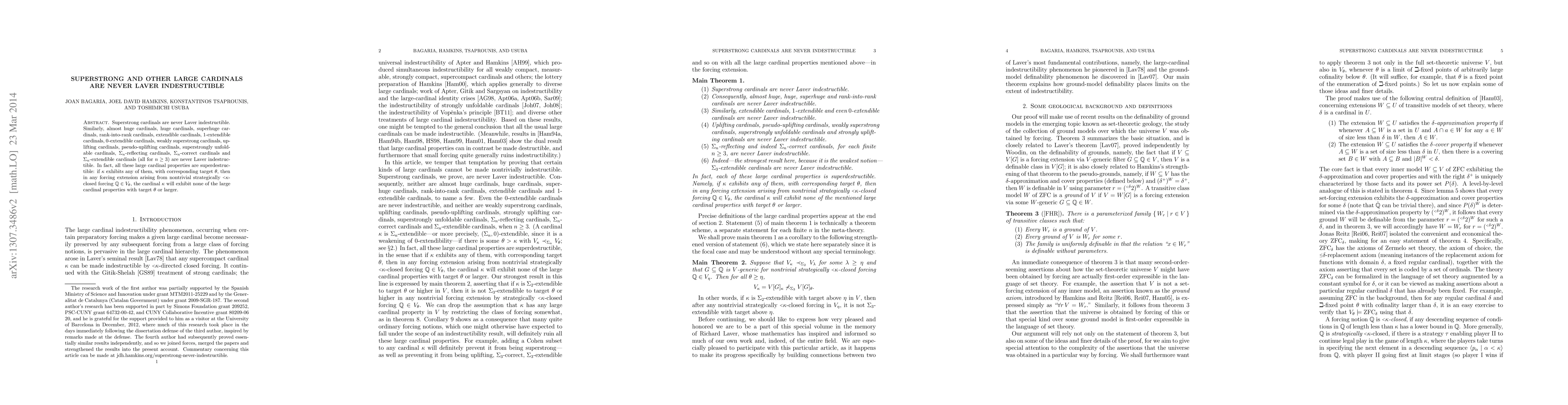 Superstrong cardinals are never Laver indestructible. Similarly, almost huge cardinals, huge cardinals, superhuge cardinals, rank-into-rank cardinals, extendible cardinals, 1-extendible cardinals, 0-extendible cardinals, weakly superstrong cardinals, uplifting cardinals, pseudo-uplifting cardinals, superstrongly unfoldable cardinals, \Sigma_n-reflecting cardinals, \Sigma_n-correct cardinals and \Sigma_n-extendible cardinals (all for n>2) are never Laver indestructible. In fact, all these large cardinal properties are superdestructible: if \kappa\ exhibits any of them, with corresponding target \theta, then in any forcing extension arising from nontrivial strategically <\kappa-closed forcing Q in V_\theta, the cardinal \kappa\ will exhibit none of the large cardinal properties with target \theta\ or larger.