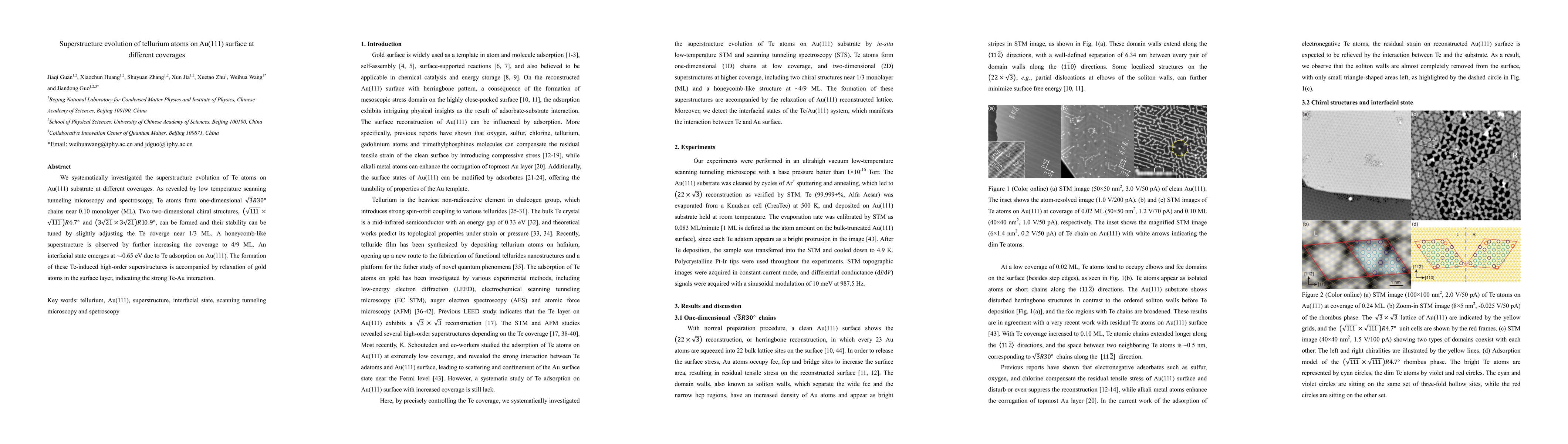Researchers investigated Te atom superstructure evolution on Au(111) at different coverages, discovering chiral structures, a honeycomb-like pattern, and an interfacial state with strong Te-Au interaction.