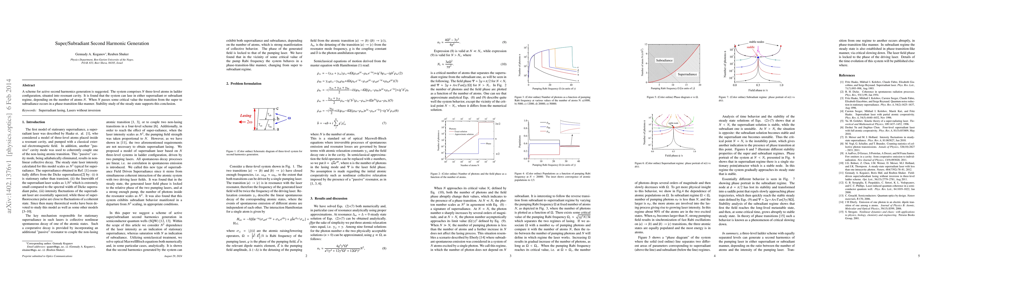 A scheme for active second harmonics generation is suggested. The system comprises $N$ three-level atoms in ladder configuration, situated into resonant cavity. It is found that the system can lase in either superradiant or subradiant regime, depending on the number of atoms $N$. When N passes some critical value the transition from the super to subradiance occurs in a phase-transition-like manner. Stability study of the steady state supports this conclusion.