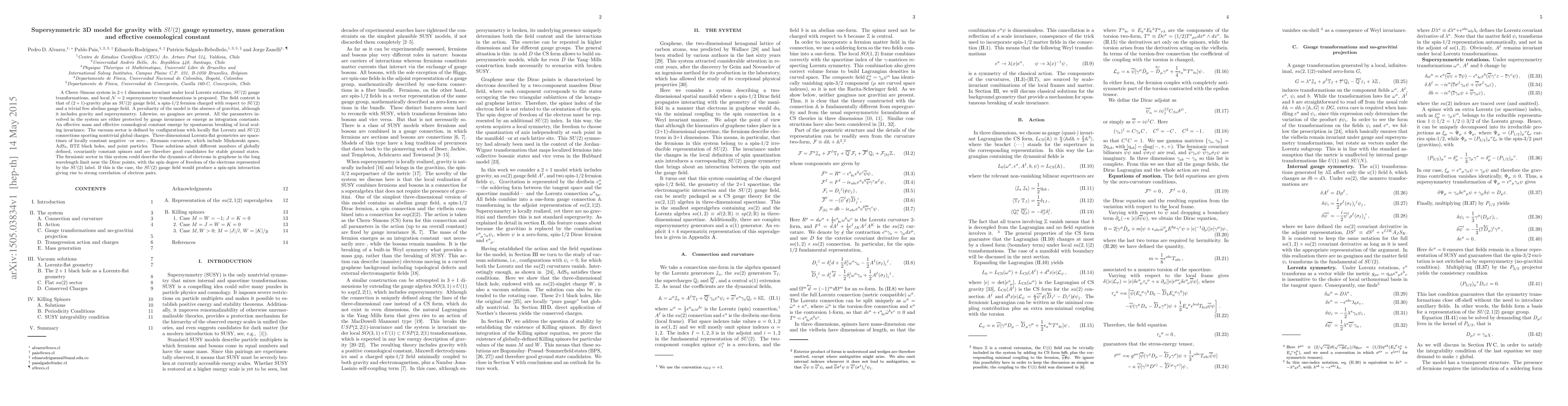 A Chern--Simons system in $2+1$ dimensions invariant under local Lorentz rotations, $SU(2)$ gauge transformations, and local $\mathcal{N}=2$ supersymmetry transformations is proposed. The field content is that of $(2+1)$-gravity plus an $SU(2)$ gauge field, a spin-1/2 fermion charged with respect to $SU(2)$ and a trivial free abelian gauge field. A peculiarity of the model is the absence of gravitini, although it includes gravity and supersymmetry. Likewise, no gauginos are present. All the parameters involved in the system are either protected by gauge invariance or emerge as integration constants. An effective mass and effective cosmological constant emerge by spontaneus breaking of local scaling invariance. The vacuum sector is defined by configurations with locally flat Lorentz and $SU(2)$ connections sporting nontrivial global charges. Three-dimensional Lorentz-flat geometries are spacetimes of locally constant negative --or zero--, Riemann curvature, which include Minkowski space, AdS$_3$, BTZ black holes, and point particles. These solutions admit different numbers of globally defined, covariantly constant spinors and are therefore good candidates for stable ground states. The fermionic sector in this system could describe the dynamics of electrons in graphene in the long wavelength limit near the Dirac points, with the spin degree of freedom of the electrons represented by the $SU(2)$ label. If this is the case, the $SU(2)$ gauge field would produce a spin-spin interaction giving rise to strong correlation of electron pairs.