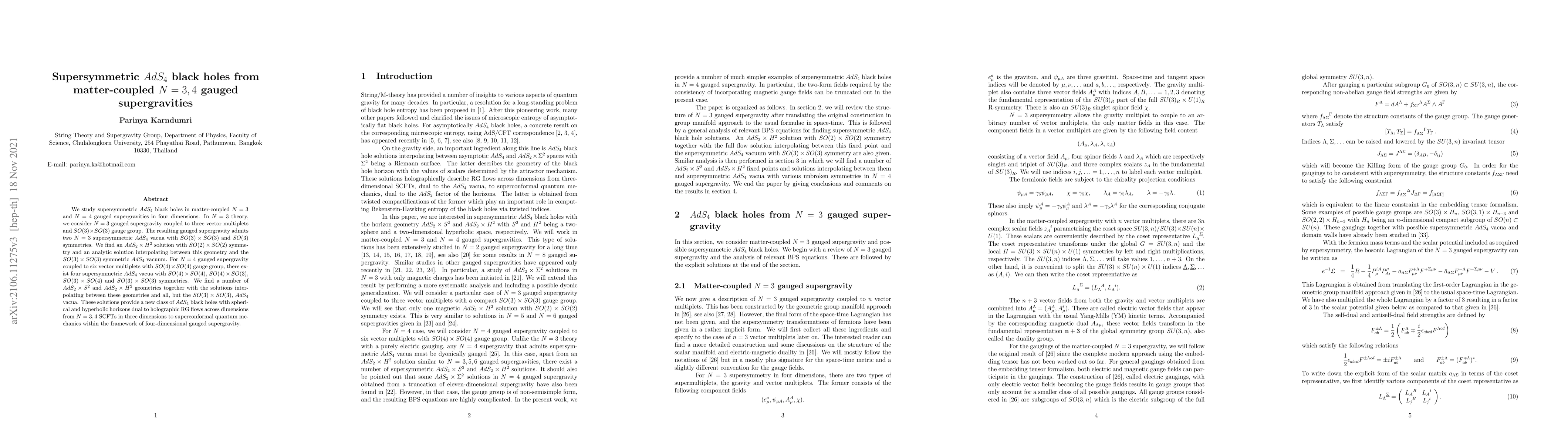 We study supersymmetric $AdS_4$ black holes in matter-coupled $N=3$ and $N=4$ gauged supergravities in four dimensions. In $N=3$ theory, we consider $N=3$ gauged supergravity coupled to three vector multiplets and $SO(3)\times SO(3)$ gauge group. The resulting gauged supergravity admits two $N=3$ supersymmetric $AdS_4$ vacua with $SO(3)\times SO(3)$ and $SO(3)$ symmetries. We find an $AdS_2\times H^2$ solution with $SO(2)\times SO(2)$ symmetry and an analytic solution interpolating between this geometry and the $SO(3)\times SO(3)$ symmetric $AdS_4$ vacuum. For $N=4$ gauged supergravity coupled to six vector multiplets with $SO(4)\times SO(4)$ gauge group, there exist four supersymmetric $AdS_4$ vacua with $SO(4)\times SO(4)$, $SO(4)\times SO(3)$, $SO(3)\times SO(4)$ and $SO(3)\times SO(3)$ symmetries. We find a number of $AdS_2\times S^2$ and $AdS_2\times H^2$ geometries together with the solutions interpolating between these geometries and all, but the $SO(3)\times SO(3)$, $AdS_4$ vacua. These solutions provide a new class of $AdS_4$ black holes with spherical and hyperbolic horizons dual to holographic RG flows across dimensions from $N=3,4$ SCFTs in three dimensions to superconformal quantum mechanics within the framework of four-dimensional gauged supergravity.