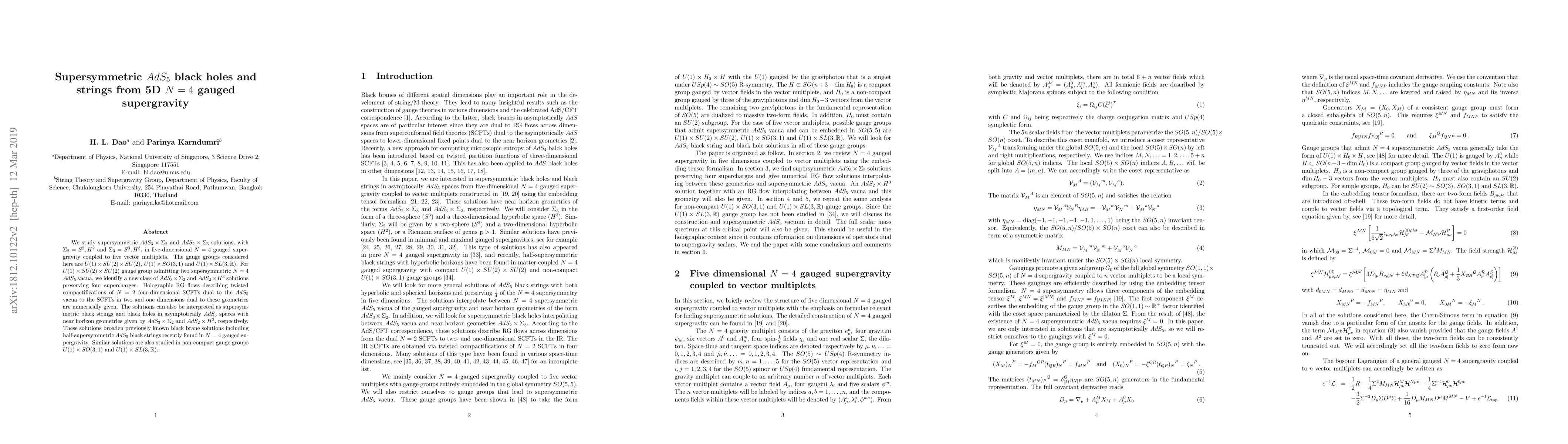 This paper explores supersymmetric $AdS_5$ black holes and strings in five-dimensional $N=4$ gauged supergravity, identifying new $AdS_3\times \Sigma_2$ and $AdS_2\times H^3$ solutions preserving four supercharges. These solutions describe holographic RG flows and extend known black brane solutions.