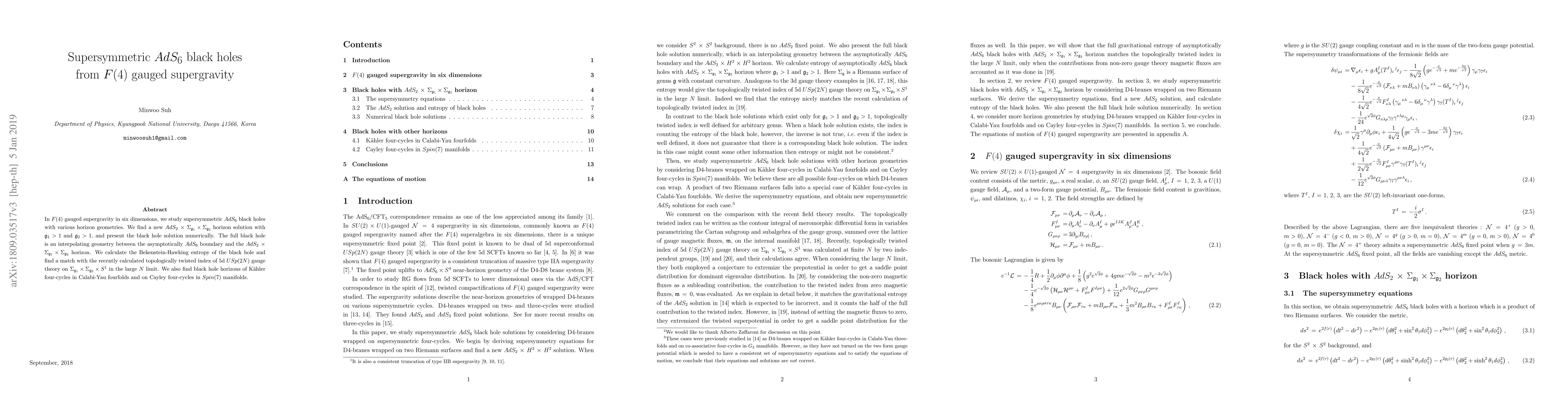 The research employs F(4) gauged supergravity in six dimensions to study supersymmetric AdS6 black holes with various horizon geometries, including a novel AdS2 × Σg1 × Σg2 solution with g1 > 1 and g2 > 1.