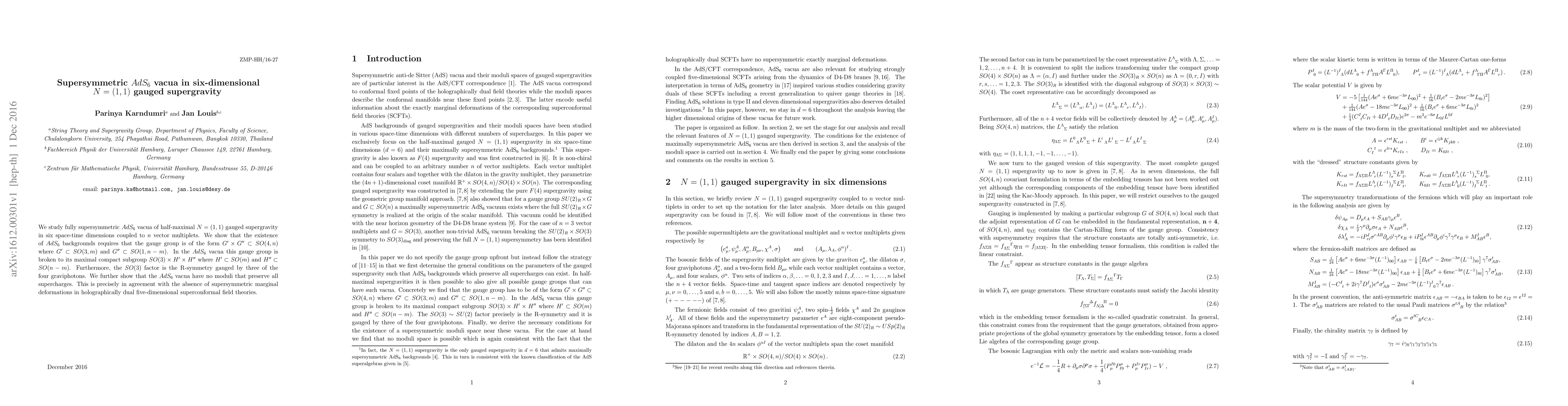 This paper investigates fully supersymmetric $AdS_6$ vacua in six-dimensional $N=(1,1)$ gauged supergravity, revealing that the gauge group must be $G'\times G"\subset SO(4,n)$ and breaks to $SO(3)\times H'\times H"$ in these vacua. It concludes that the $AdS_6$ vacua have no moduli preserving all supercharges, consistent with the lack of supersymmetric marginal deformations in their holographic duals.