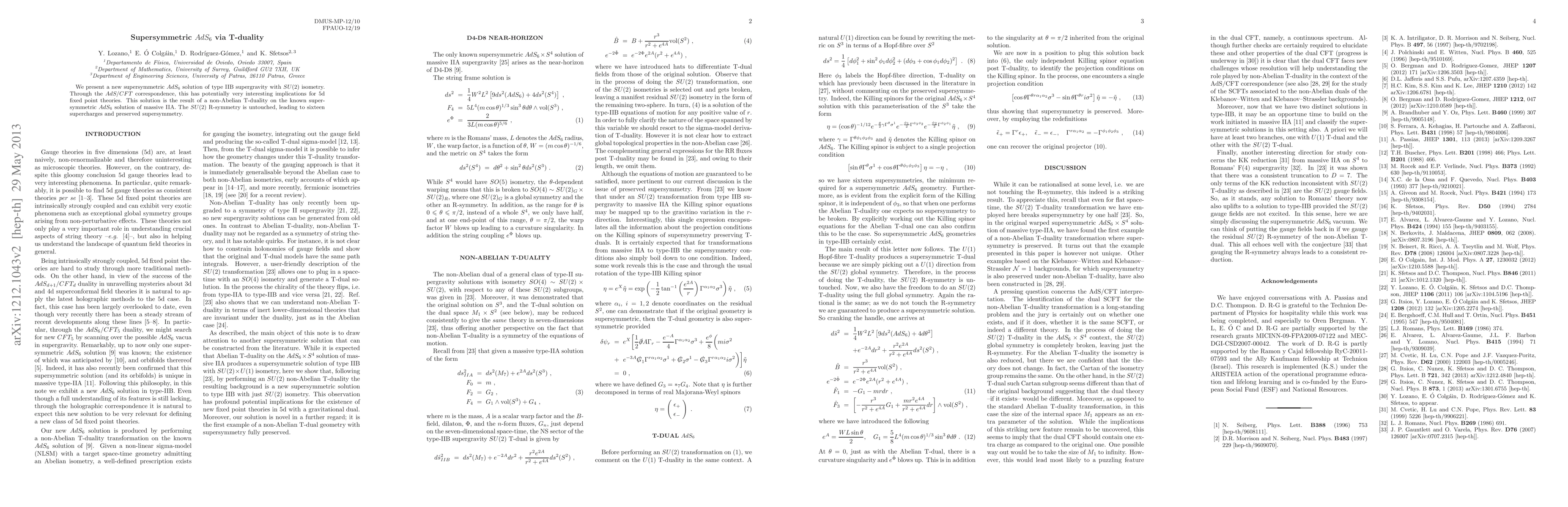 We present a new supersymmetric AdS_6 solution of type IIB supergravity with SU(2) isometry. Through the AdS/CFT correspondence, this has potentially very interesting implications for 5d fixed point theories. This solution is the result of a non-Abelian T-duality on the known supersymmetric AdS_6 solution of massive IIA. The SU(2) R-symmetry is untouched, leading to sixteen supercharges and preserved supersymmetry.