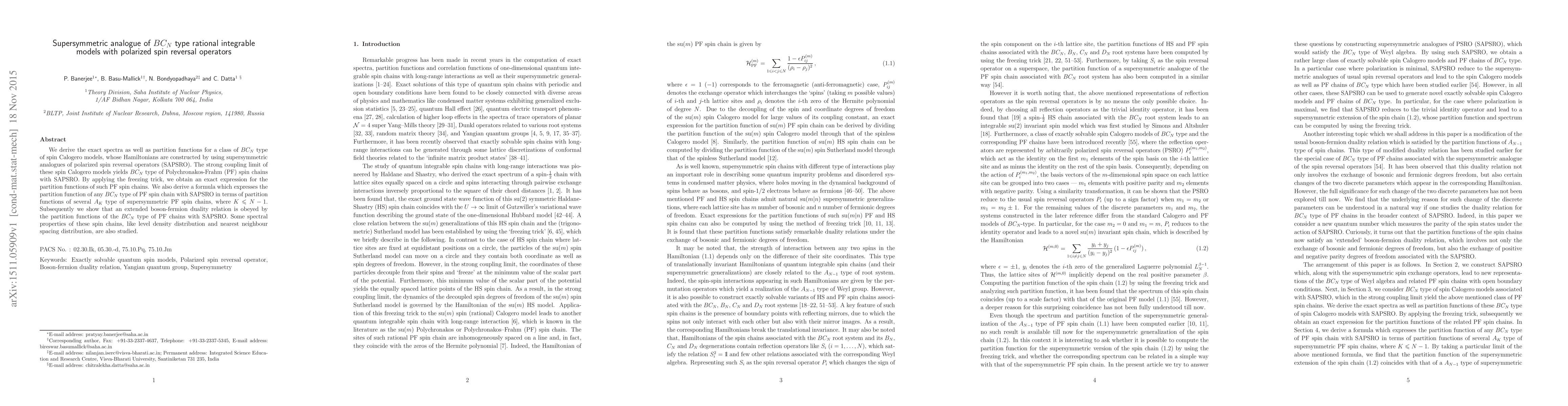 This paper derives the exact spectra and partition functions for supersymmetric analogues of $BC_N$ type spin Calogero models using polarized spin reversal operators. It establishes a strong coupling limit yielding $BC_N$ type Polychronakos-Frahm spin chains and derives a formula linking their partition functions to those of $A_K$ type supersymmetric spin chains, revealing a boson-fermion duality relation.