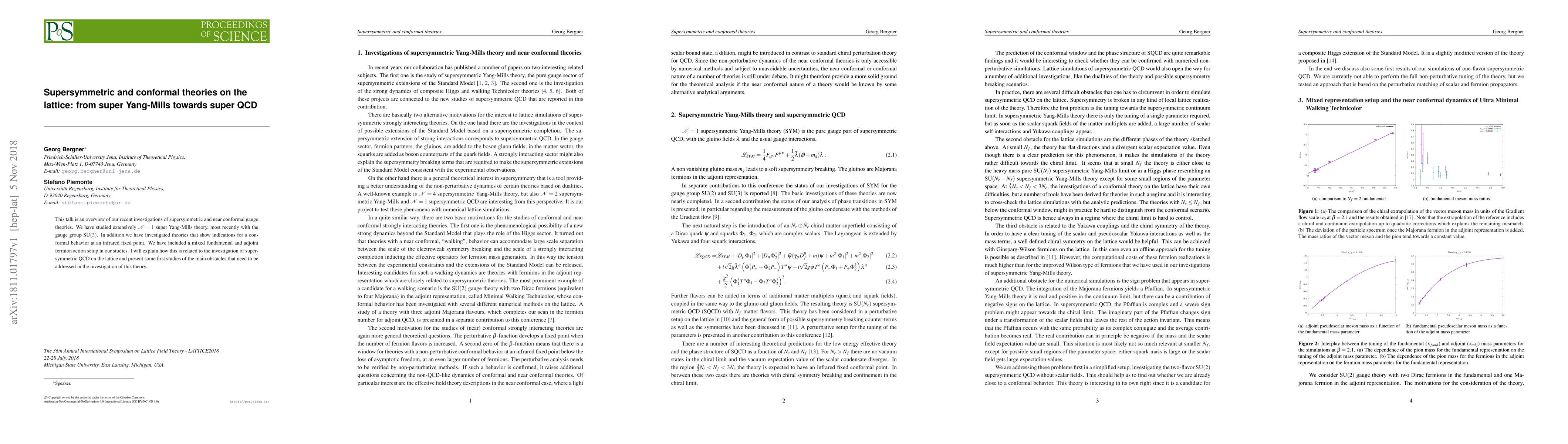 This paper provides an overview of recent studies on $\mathcal{N}=1$ supersymmetric Yang-Mills theory with SU(3) gauge group and explores near conformal gauge theories, including a mixed fundamental and adjoint fermion action setup. It also discusses initial findings on the challenges in investigating supersymmetric QCD on the lattice.