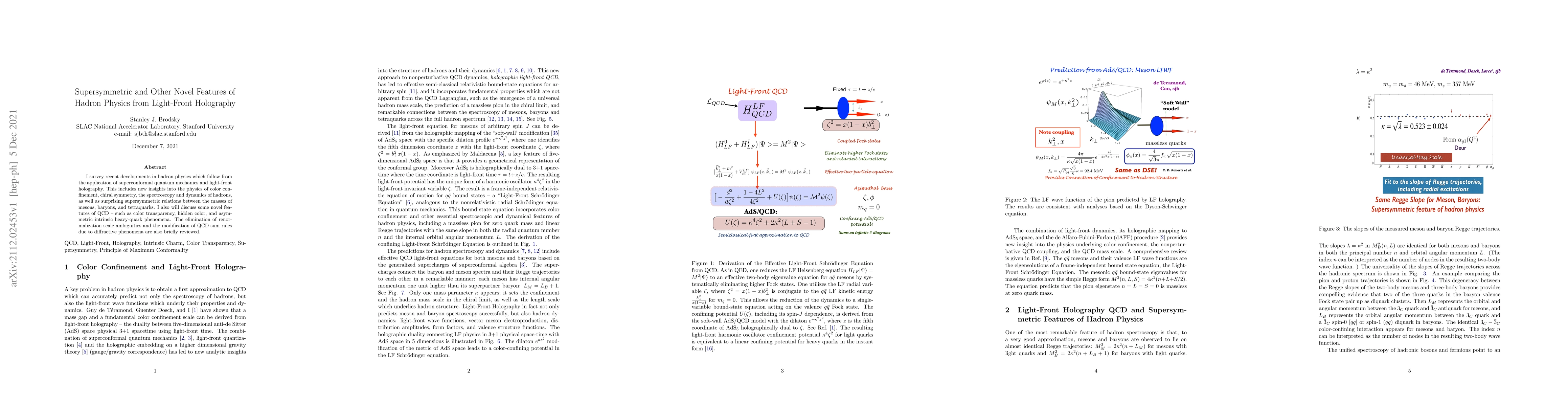 This paper surveys recent advancements in hadron physics derived from superconformal quantum mechanics and light-front holography, revealing novel insights into color confinement, chiral symmetry, hadron dynamics, and unexpected supersymmetric mass relations. It also explores unique QCD features like color transparency and hidden color.
