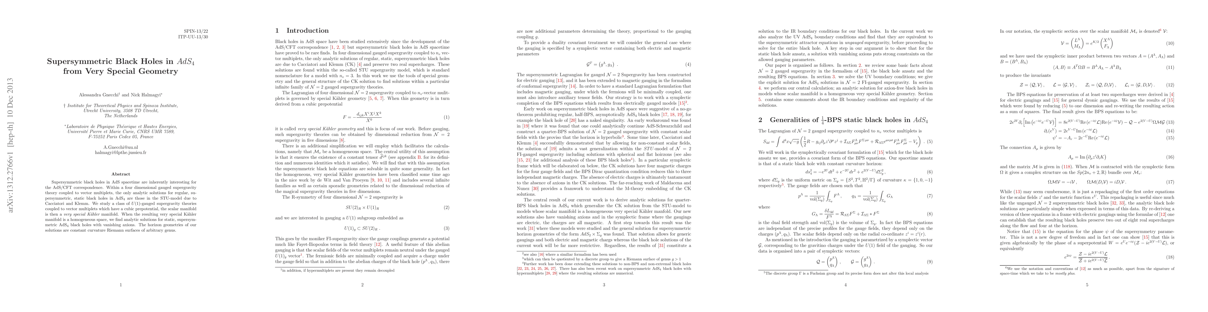 This paper explores the construction of analytic solutions for supersymmetric black holes in four-dimensional AdS spacetime, focusing on the STU-model within a gauged supergravity framework. It identifies a class of U(1)-gauged supergravity theories with cubic prepotentials, leading to very special Kähler manifolds, and finds analytic solutions for static, supersymmetric AdS4 black holes with vanishing axions, characterized by constant curvature Riemann surfaces of arbitrary genus.