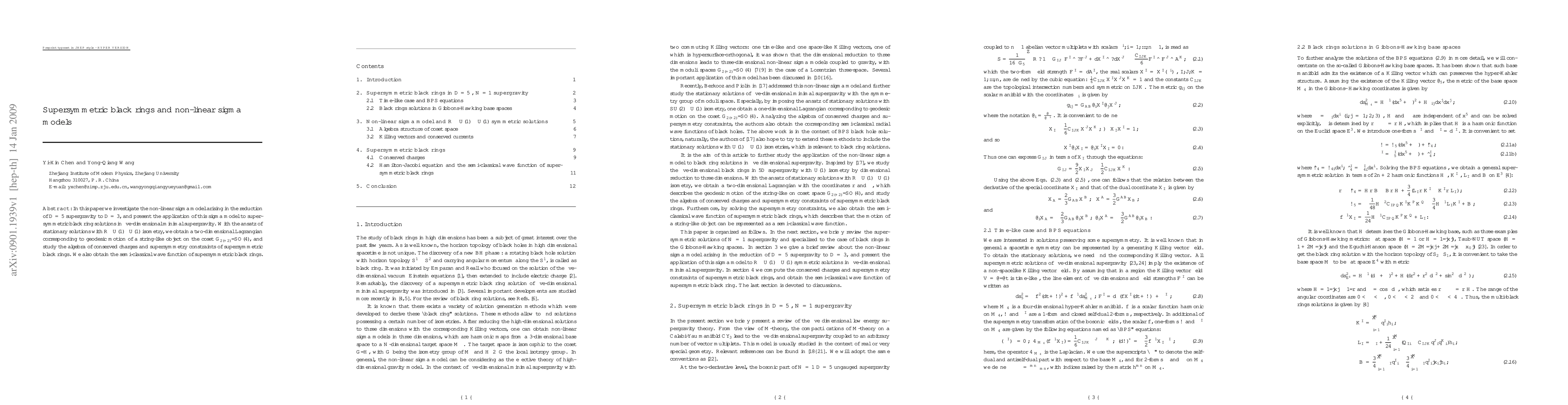 This paper examines a non-linear sigma model from D = 5 supergravity reduction to D = 3, applying it to supersymmetric black ring solutions in five-dimensional minimal supergravity. The study investigates the algebra of conserved charges and supersymmetry constraints of these black rings, alongside deriving their semi-classical wave function.