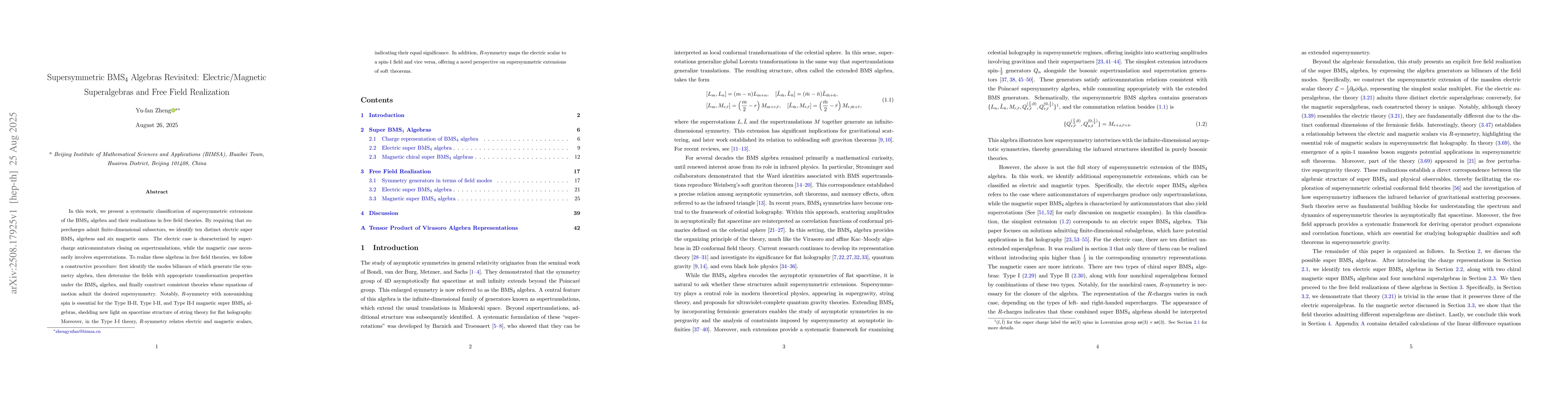 In this work, we present a systematic classification of supersymmetric extensions of the BMS$_4$ algebra and their realizations in free field theories. By requiring that supercharges admit finite-dimensional subsectors, we identify ten distinct electric super BMS$_4$ algebras and six magnetic ones. The electric case is characterized by supercharge anticommutators closing on supertranslations, while the magnetic case necessarily involves superrotations. To realize these algebras in free field theories, we follow a constructive procedure: first identify the modes bilinears of which generate the symmetry algebra, then determine the fields with appropriate transformation properties under the BMS$_4$ algebra, and finally construct consistent theories whose equations of motion admit the desired supersymmetry. Notably, $R$-symmetry with nonvanishing spin is essential for the Type II-II, Type I-II, and Type II-I magnetic super BMS$_4$ algebras, shedding new light on spacetime structure of string theory for flat holography. Moreover, in the Type I-I theory, $R$-symmetry relates electric and magnetic scalars, indicating their equal significance. In addition, $R$-symmetry maps the electric scalar to a spin-$1$ field and vice versa, offering a novel perspective on supersymmetric extensions of soft theorems.