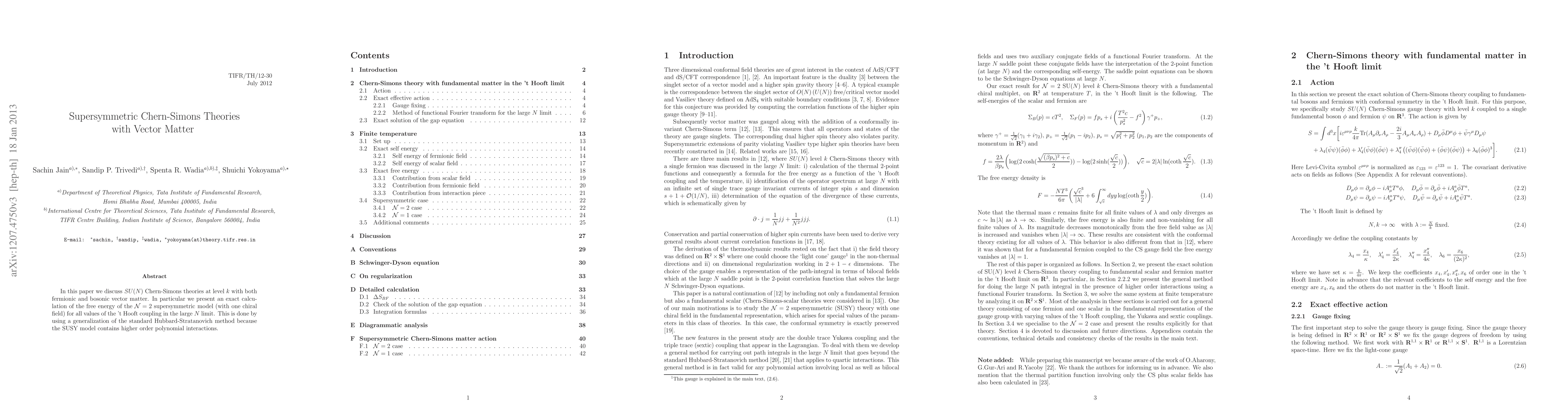 In this paper we discuss SU(N) Chern-Simons theories at level k with both fermionic and bosonic vector matter. In particular we present an exact calculation of the free energy of the N=2 supersymmetric model (with one chiral field) for all values of the 't Hooft coupling in the large N limit. This is done by using a generalization of the standard Hubbard-Stratanovich method because the SUSY model contains higher order polynomial interactions.