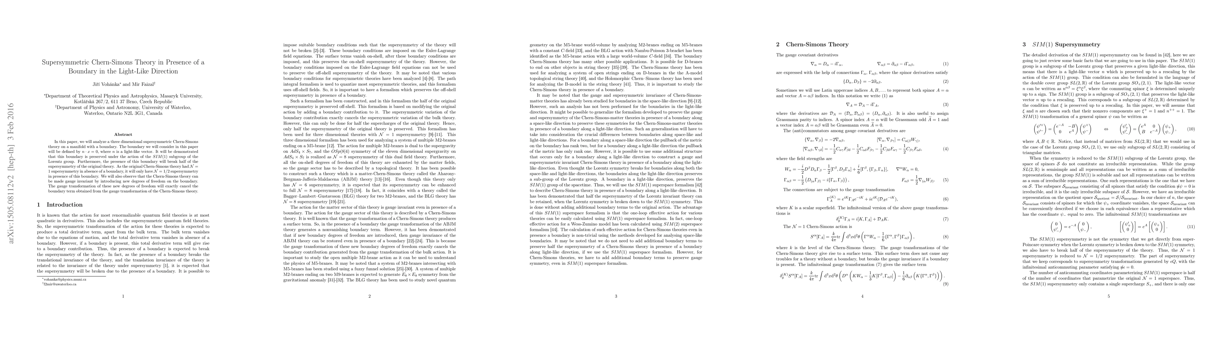 In this paper, we will analyze a three dimensional supersymmetric Chern-Simons theory on a manifold with a boundary. The boundary we will consider in this paper will be defined by $n\cdot x=0$, where $n$ is a light-like vector. It will be demonstrated that this boundary is preserved under the action of the $SIM(1)$ subgroup of the Lorentz group. Furthermore, the presence of this boundary will break half of the supersymmetry of the original theory. As the original Chern-Simons theory had $\mathcal{N} =1$ supersymmetry in absence of a boundary, it will only have $\mathcal{N}=1/2$ supersymmetry in presence of this boundary. We will also observe that the Chern-Simons theory can be made gauge invariant by introducing new degrees of freedom on the boundary. The gauge transformation of these new degrees of freedom will exactly cancel the boundary term obtained from the gauge transformation of the Chern-Simons theory.
