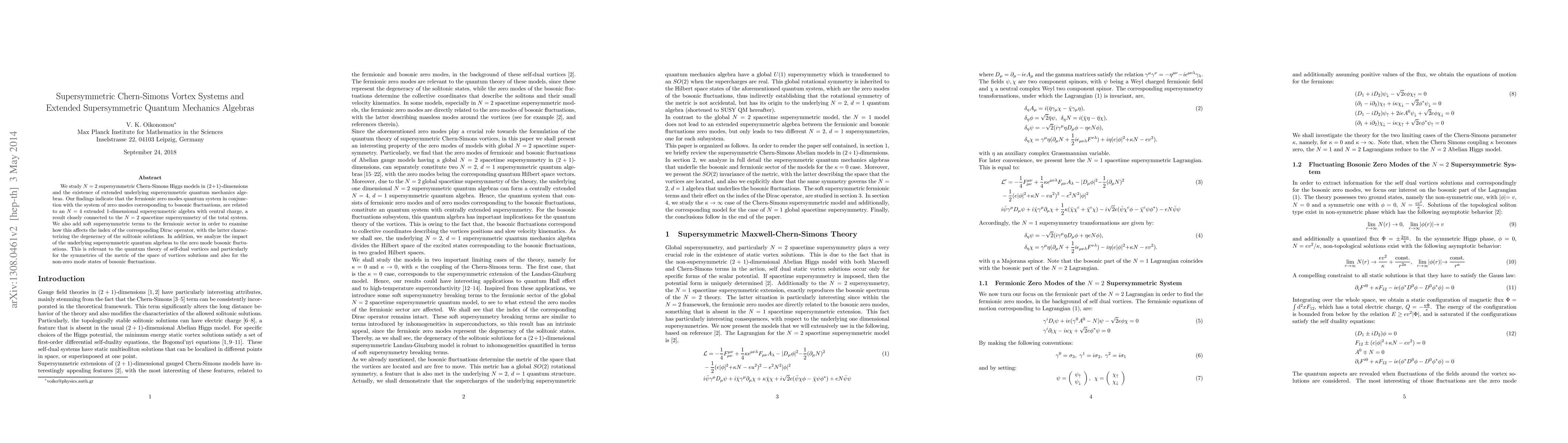 This paper investigates N=2 supersymmetric Chern-Simons Higgs models in 2+1 dimensions and reveals the existence of an N=4 extended supersymmetric quantum mechanics algebra associated with zero modes. It also explores the impact of soft supersymmetric terms on the Dirac operator index and the role of underlying supersymmetric algebras in zero mode bosonic fluctuations.
