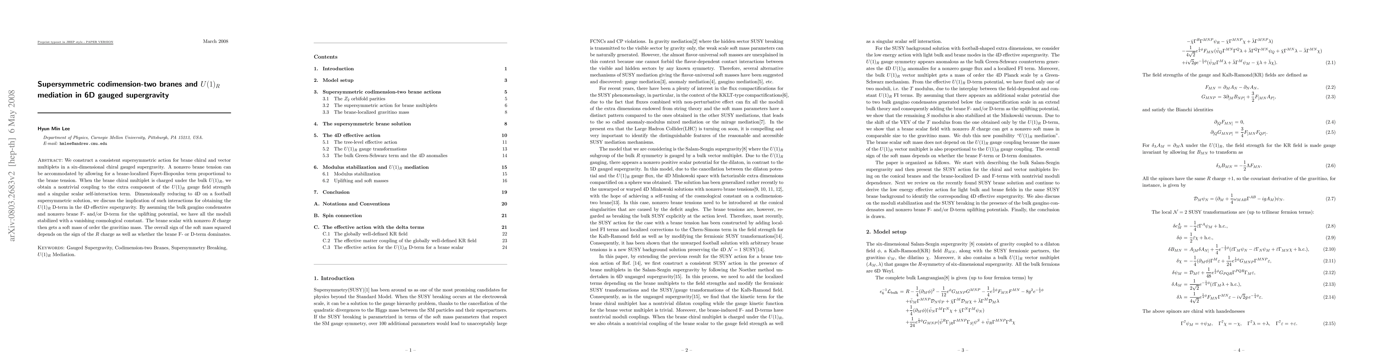 This paper constructs a supersymmetric action for 6D gauged supergravity with codimension-two branes, showing how brane tension is mediated via a Fayet-Iliopoulos term. It discusses the implications of these interactions for U(1)_R mediation in 4D effective supergravity, leading to moduli stabilization and soft mass generation for brane scalars with nonzero R charge.