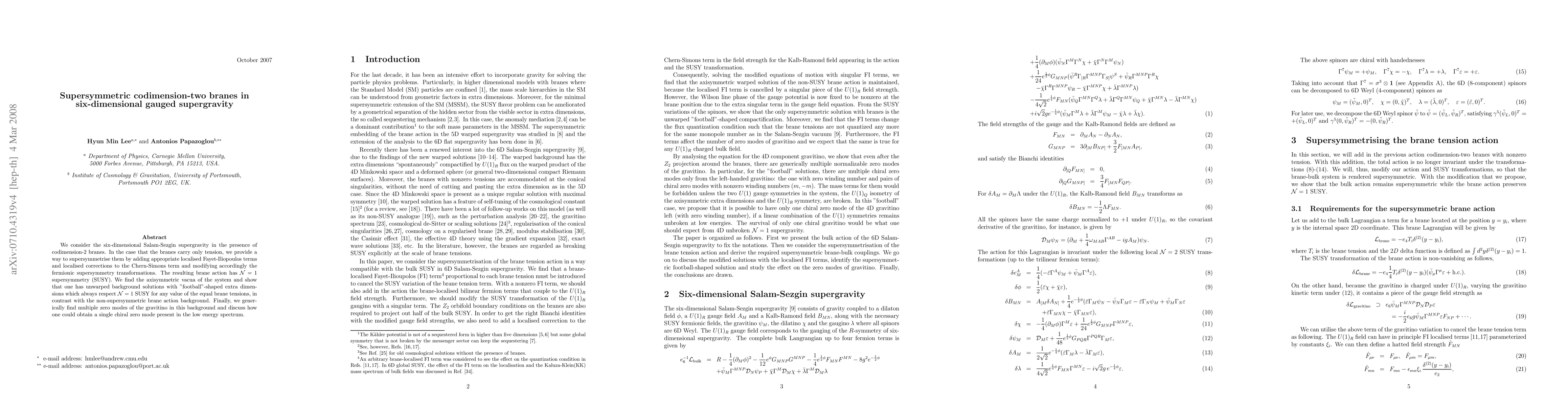 This paper explores supersymmetric codimension-two branes in six-dimensional gauged supergravity, achieving N=1 SUSY by adding localised terms and modifying fermionic transformations. It finds unwarped, football-shaped extra dimensions respecting N=1 SUSY, unlike non-supersymmetric brane actions, and discusses potential single chiral gravitino zero modes.
