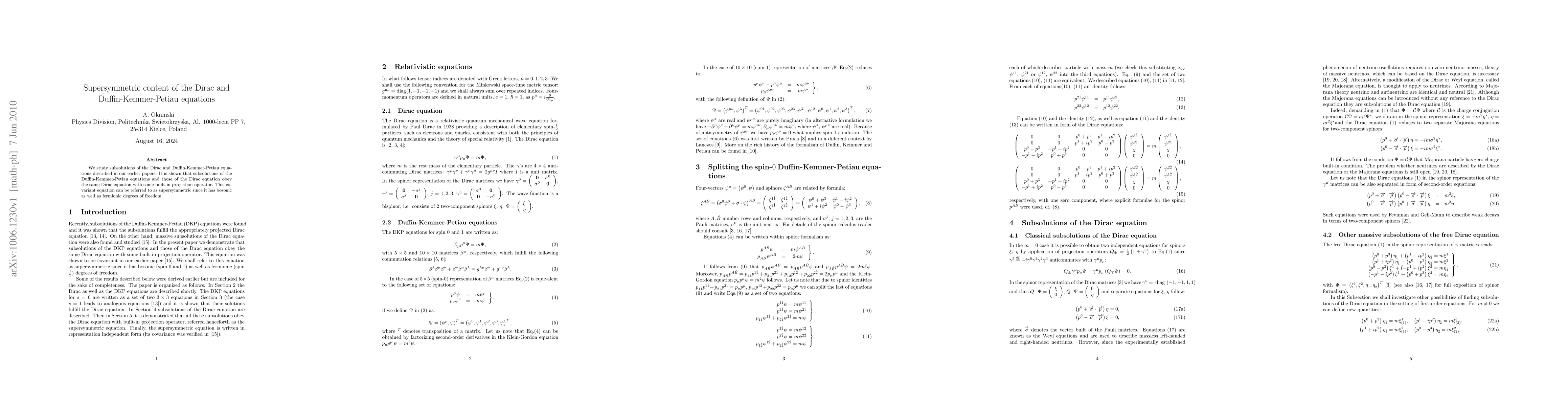 We study subsolutions of the Dirac and Duffin-Kemmer-Petiau equations described in our earlier papers. It is shown that subsolutions of the Duffin-Kemmer-Petiau equations and those of the Dirac equation obey the same Dirac equation with some built-in projection operator. This covariant equation can be referred to as supersymmetric since it has bosonic as well as fermionic degrees of freedom.