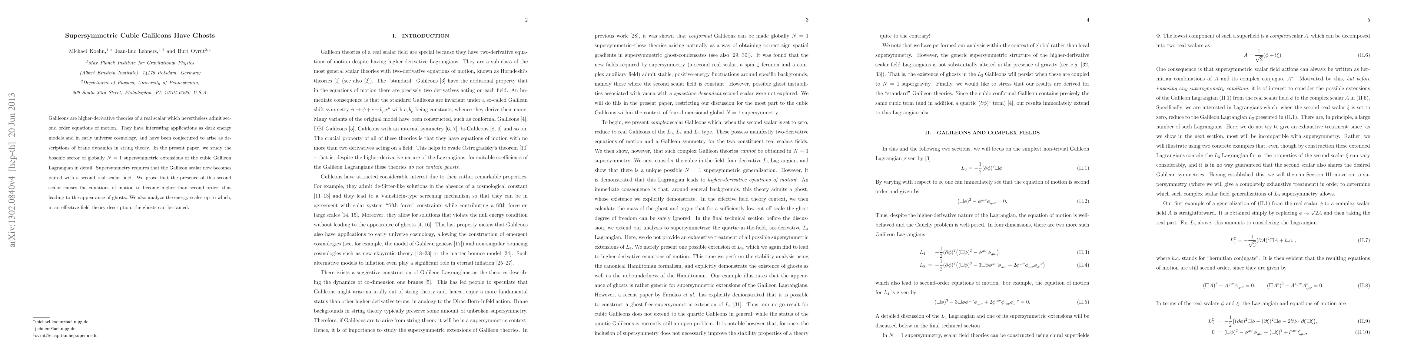 Galileons are higher-derivative theories of a real scalar which nevertheless admit second order equations of motion. They have interesting applications as dark energy models and in early universe cosmology, and have been conjectured to arise as descriptions of brane dynamics in string theory. In the present paper, we study the bosonic sector of globally N=1 supersymmetric extensions of the cubic Galileon Lagrangian in detail. Supersymmetry requires that the Galileon scalar now becomes paired with a second real scalar field. We prove that the presence of this second scalar causes the equations of motion to become higher than second order, thus leading to the appearance of ghosts. We also analyze the energy scales up to which, in an effective field theory description, the ghosts can be tamed.