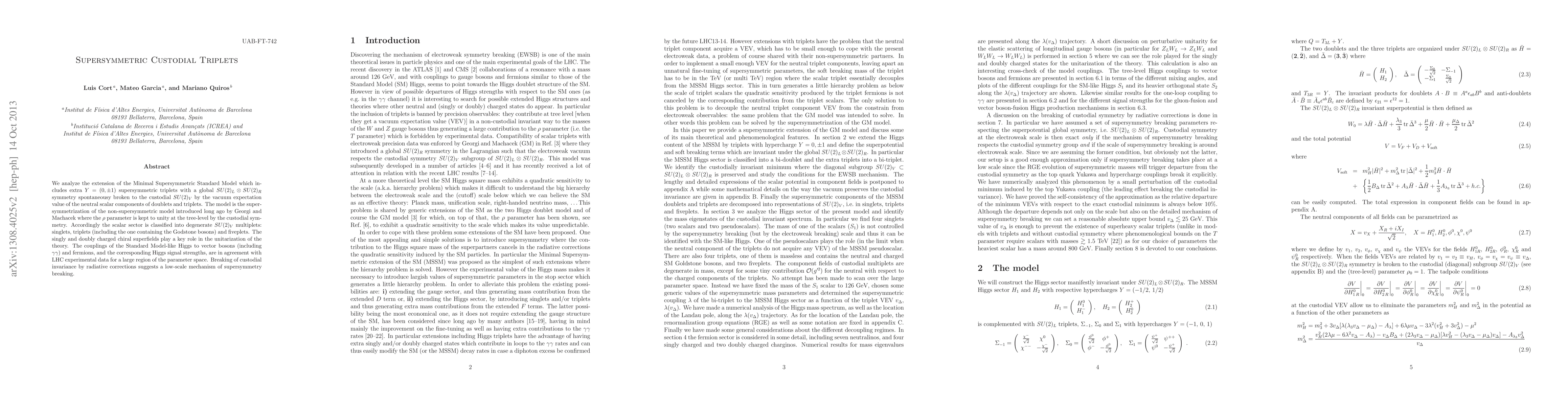 This paper explores an extended Minimal Supersymmetric Standard Model incorporating supersymmetric triplets that maintain custodial symmetry, ensuring the \rho-parameter remains unity at tree-level. The model predicts a scalar sector with degenerate SU(2)_V multiplets and aligns with LHC data for Higgs couplings, suggesting a low-scale supersymmetry breaking mechanism.