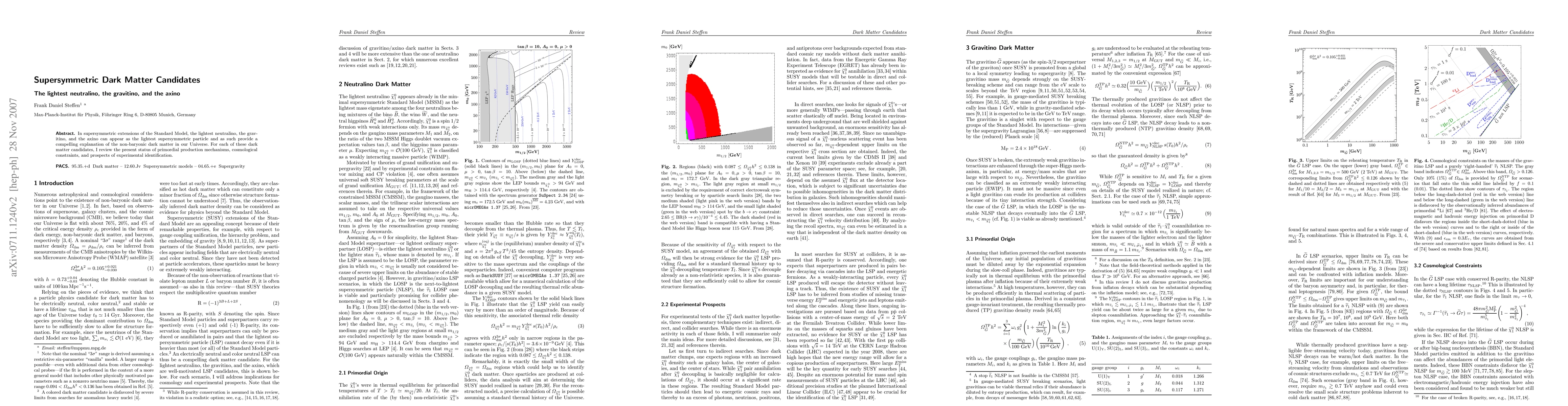 This paper reviews supersymmetric dark matter candidates, focusing on the lightest neutralino, gravitino, and axino. It examines their primordial production, cosmological constraints, and potential for experimental detection.