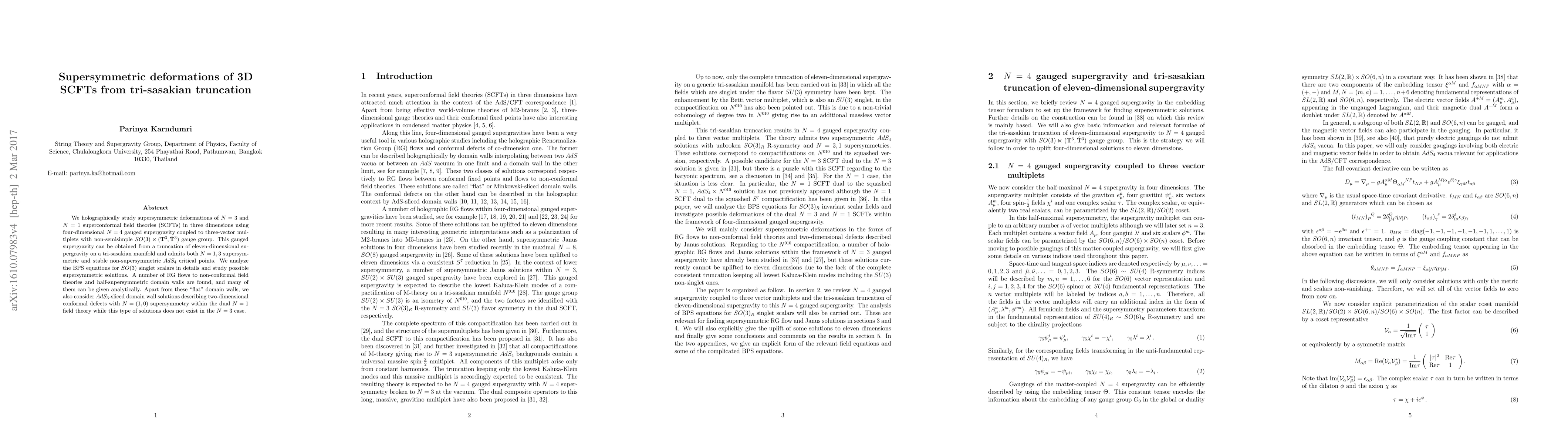 This paper studies supersymmetric deformations of 3D superconformal field theories (SCFTs) using holographic methods and gauged supergravity, revealing various RG flows and domain walls, including unique $AdS_3$-sliced solutions for $N=1$ theories. The analysis focuses on the $N=1,3$ supersymmetric critical points derived from tri-sasakian truncations.