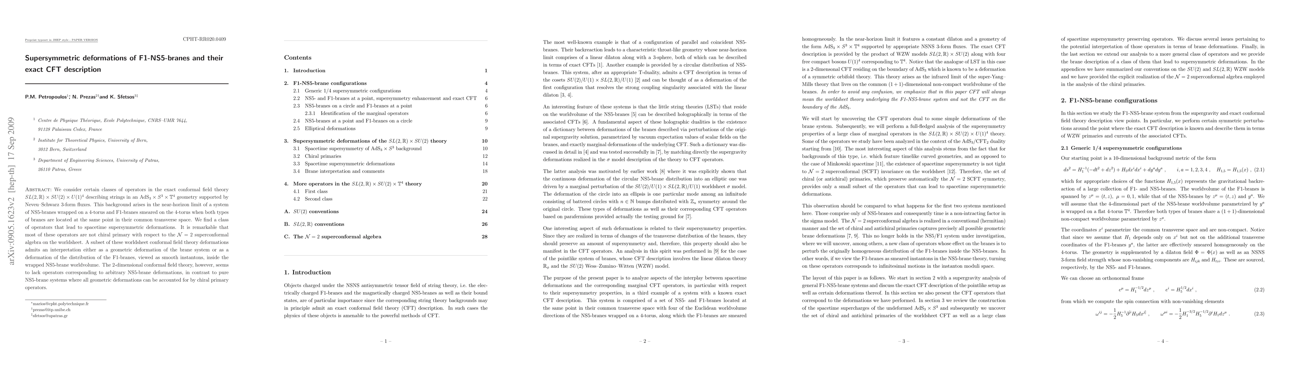 This paper explores supersymmetric deformations in the exact conformal field theory describing strings in an AdS(3) x S(3) x T4 background, which emerges from NS5-branes and F1-branes. It identifies a class of operators that cause spacetime deformations, noting that many are not chiral primary, unlike in pure NS5-brane systems.