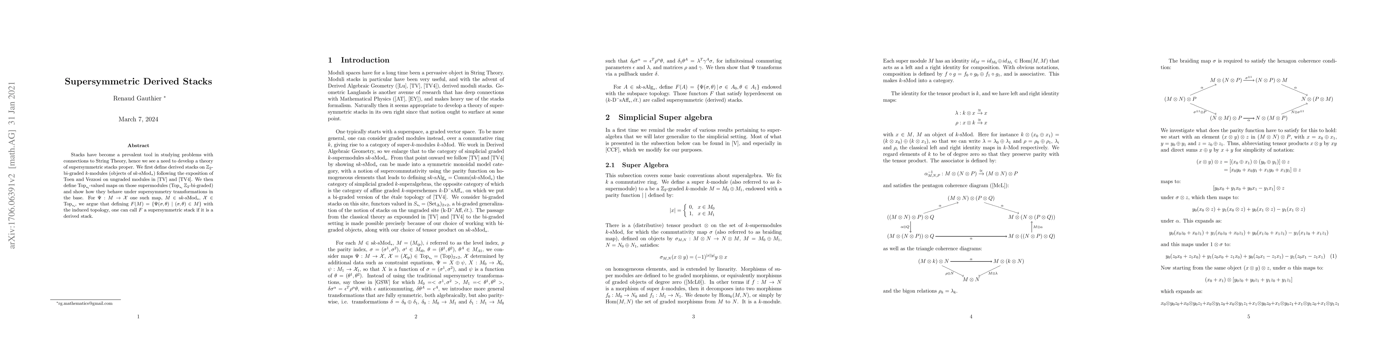 This paper develops a theory of supersymmetric stacks by defining derived stacks on $\mathbb{Z}_2$-bi-graded k-modules. It introduces $\text{Top}_{* \centerdot}$-valued maps on these supermodules and demonstrates their behavior under supersymmetry transformations, ultimately defining a prestack $F$ that qualifies as a supersymmetric stack when it is a derived stack.