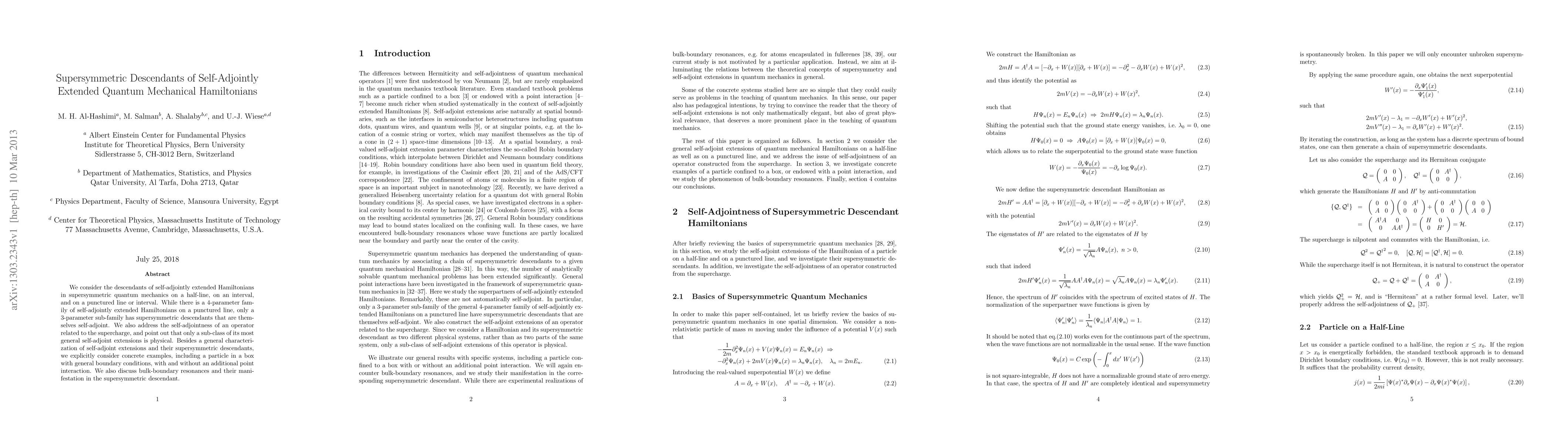 We consider the descendants of self-adjointly extended Hamiltonians in supersymmetric quantum mechanics on a half-line, on an interval, and on a punctured line or interval. While there is a 4-parameter family of self-adjointly extended Hamiltonians on a punctured line, only a 3-parameter sub-family has supersymmetric descendants that are themselves self-adjoint. We also address the self-adjointness of an operator related to the supercharge, and point out that only a sub-class of its most general self-adjoint extensions is physical. Besides a general characterization of self-adjoint extensions and their supersymmetric descendants, we explicitly consider concrete examples, including a particle in a box with general boundary conditions, with and without an additional point interaction. We also discuss bulk-boundary resonances and their manifestation in the supersymmetric descendant.