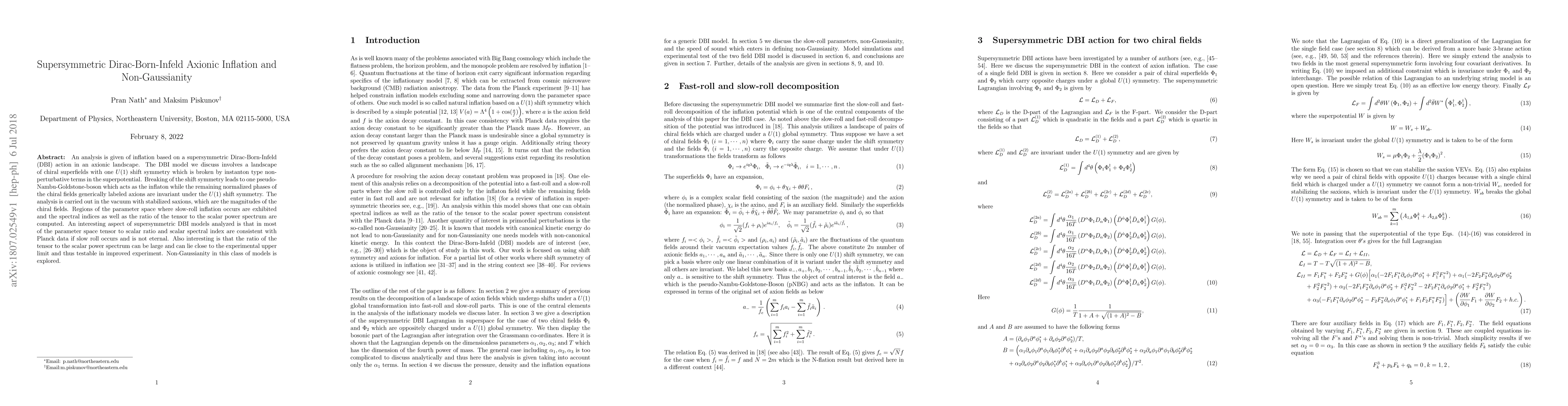 An analysis is given of inflation based on a supersymmetric Dirac-Born-Infeld (DBI) action in an axionic landscape. The DBI model we discuss involves a landscape of chiral superfields with one $U(1)$ shift symmetry which is broken by instanton type non-perturbative terms in the superpotential. Breaking of the shift symmetry leads to one pseudo-Nambu-Goldstone-boson which acts as the inflaton while the remaining normalized phases of the chiral fields generically labeled axions are invariant under the $U(1)$ shift symmetry. The analysis is carried out in the vacuum with stabilized saxions, which are the magnitudes of the chiral fields. Regions of the parameter space where slow-roll inflation occurs are exhibited and the spectral indices as well as the ratio of the tensor to the scalar power spectrum are computed. An interesting aspect of supersymmetric DBI models analyzed is that in most of the parameter space tensor to scalar ratio and scalar spectral index are consistent with Planck data if slow roll occurs and is not eternal. Also interesting is that the ratio of the tensor to the scalar power spectrum can be large and can lie close to the experimental upper limit and thus testable in improved experiment. Non-Gaussianity in this class of models is explored.