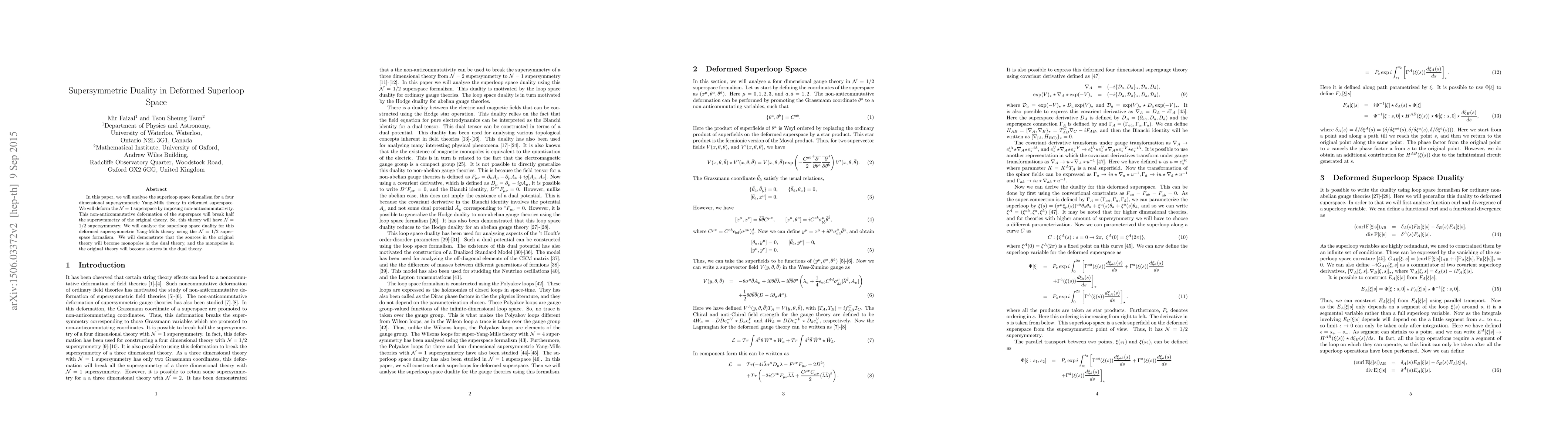 In this paper, we will analyse the superloop space formalism for a four dimensional supersymmetric Yang-Mills theory in deformed superspace. We will deform the $\mathcal{N} =1$ superspace by imposing non-anticommutativity. This non-anticommutative deformation of the superspace will break half the supersymmetry of the original theory. So, this theory will have $\mathcal{N} =1/2$ supersymmetry. We will analyse the superloop space duality for this deformed supersymmetric Yang-Mills theory using the $\mathcal{N} =1/2$ superspace formalism. We will demonstrate that the sources in the original theory will become monopoles in the dual theory, and the monopoles in the original theory will become sources in the dual theory.