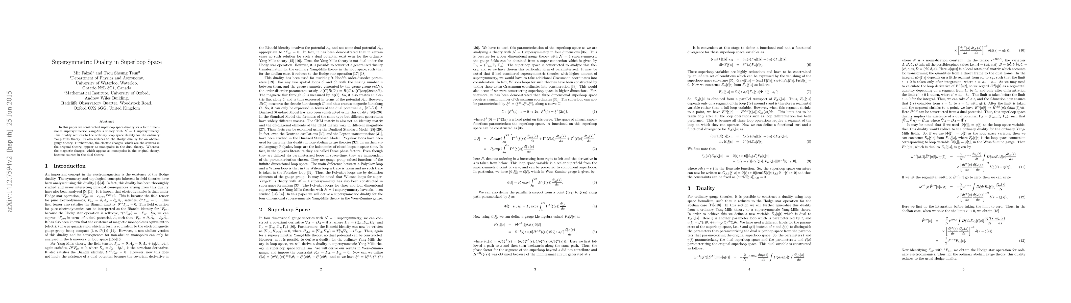 This paper constructs superloop space duality for a four-dimensional supersymmetric Yang-Mills theory with $\mathcal{N} =1$ supersymmetry, reducing to ordinary loop space duality and Hodge duality in specific cases, and swapping the roles of electric and magnetic charges between the original and dual theories.