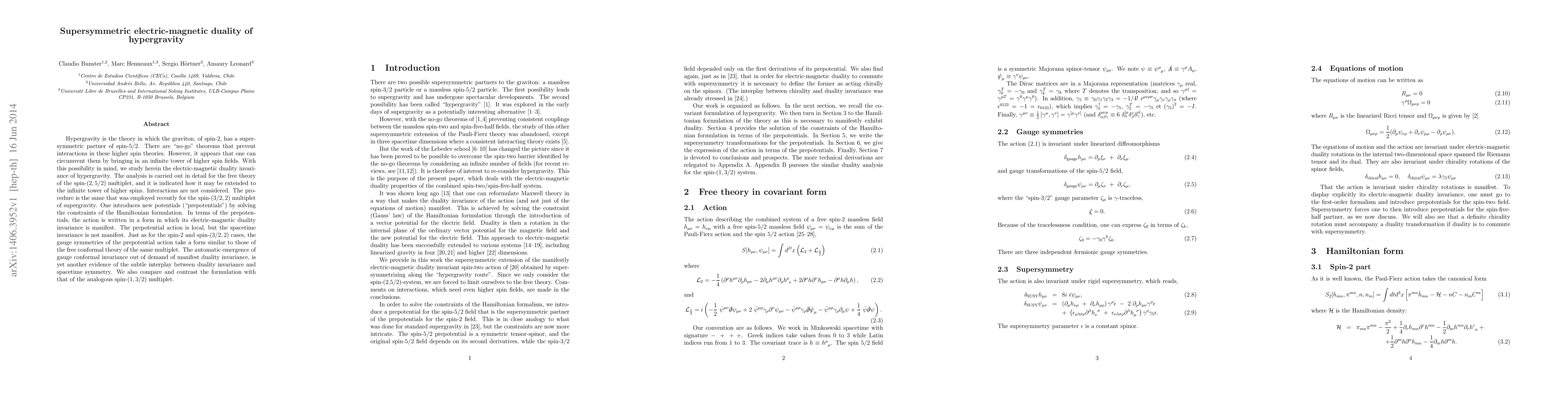 This paper explores the electric-magnetic duality invariance in the theory of hypergravity, where the graviton has a higher spin supersymmetric partner. It introduces prepotentials to manifest duality invariance and discusses the automatic emergence of gauge conformal invariance, comparing it to the spin-(3/2,2) and spin-(1,3/2) cases.