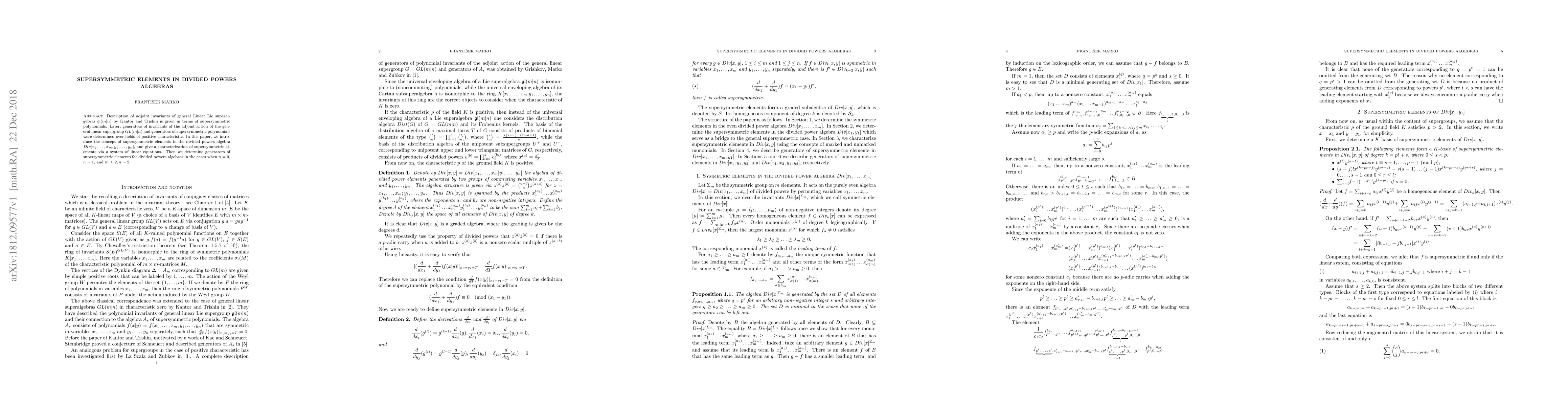 Description of adjoint invariants of general Linear Lie superalgebras $\mathfrak{gl}(m|n)$ by Kantor and Trishin is given in terms of supersymmetric polynomials. Later, generators of invariants of the adjoint action of the general linear supergroup $GL(m|n)$ and generators of supersymmetric polynomials were determined over fields of positive characteristic. In this paper, we introduce the concept of supersymmetric elements in the divided powers algebra $Div[x_1, \ldots, x_m,y_1, \ldots, y_n]$, and give a characterization of supersymmetric elements via a system of linear equations. Then we determine generators of supersymmetric elements for divided powers algebras in the cases when $n=0$, $n=1$, and $m\leq 2, n=2$.