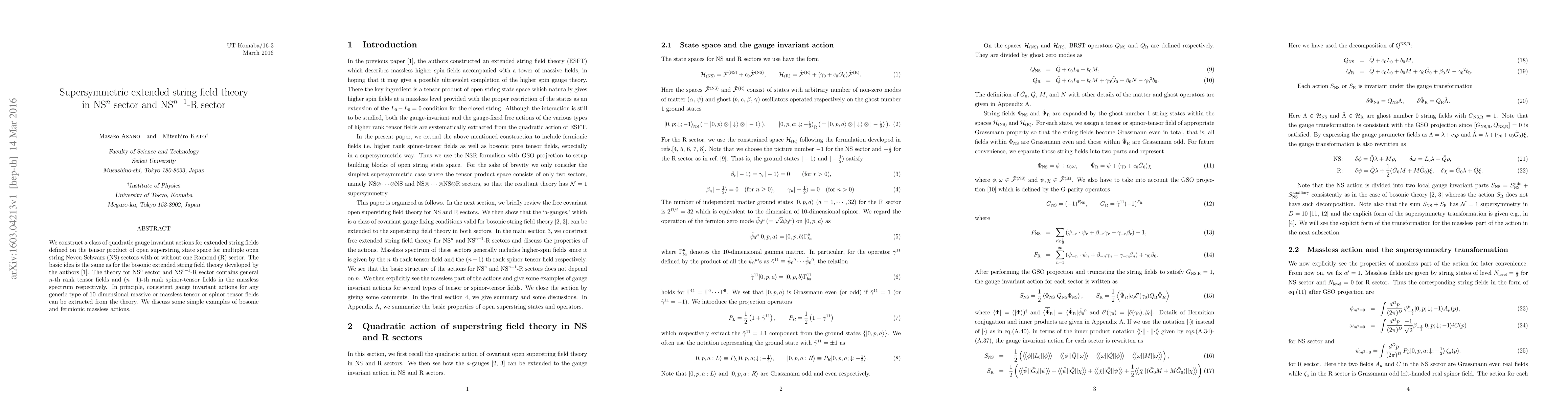 This paper constructs quadratic gauge invariant actions for extended string fields in the NS^n and NS^{n-1}-R sectors, featuring n-th rank tensor and (n-1)-th rank spinor-tensor fields. It extends previous work on bosonic extended string field theory and outlines methods for generating consistent gauge invariant actions for various 10-dimensional tensor or spinor-tensor fields.