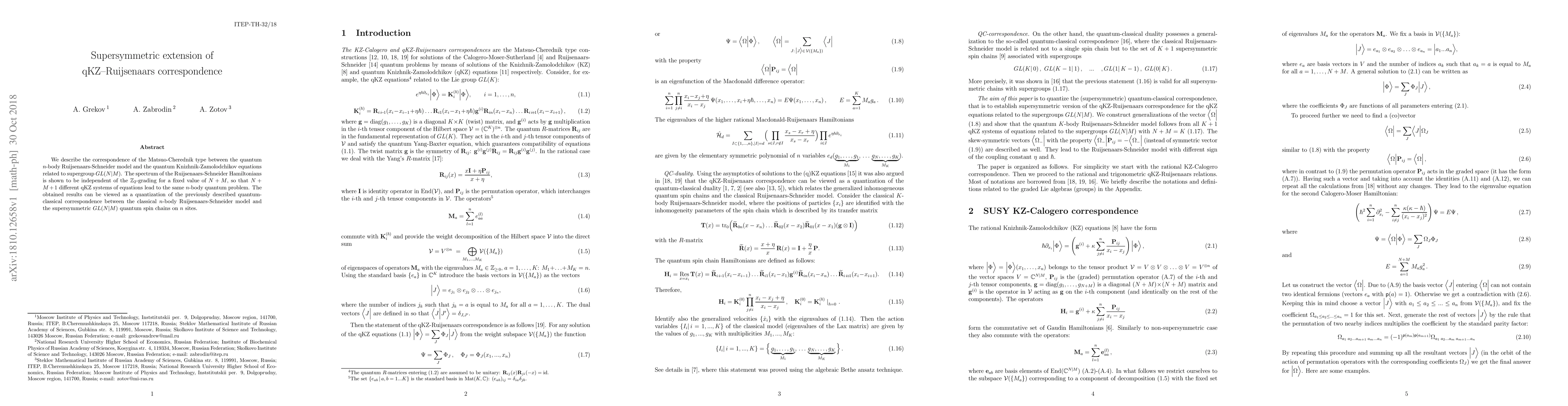 We describe the correspondence of the Matsuo-Cherednik type between the quantum $n$-body Ruijsenaars-Schneider model and the quantum Knizhnik-Zamolodchikov equations related to supergroup $GL(N|M)$. The spectrum of the Ruijsenaars-Schneider Hamiltonians is shown to be independent of the ${\mathbb Z}_2$-grading for a fixed value of $N+M$, so that $N+M+1$ different qKZ systems of equations lead to the same $n$-body quantum problem. The obtained results can be viewed as a quantization of the previously described quantum-classical correspondence between the classical $n$-body Ruijsenaars-Schneider model and the supersymmetric $GL(N|M)$ quantum spin chains on $n$ sites.