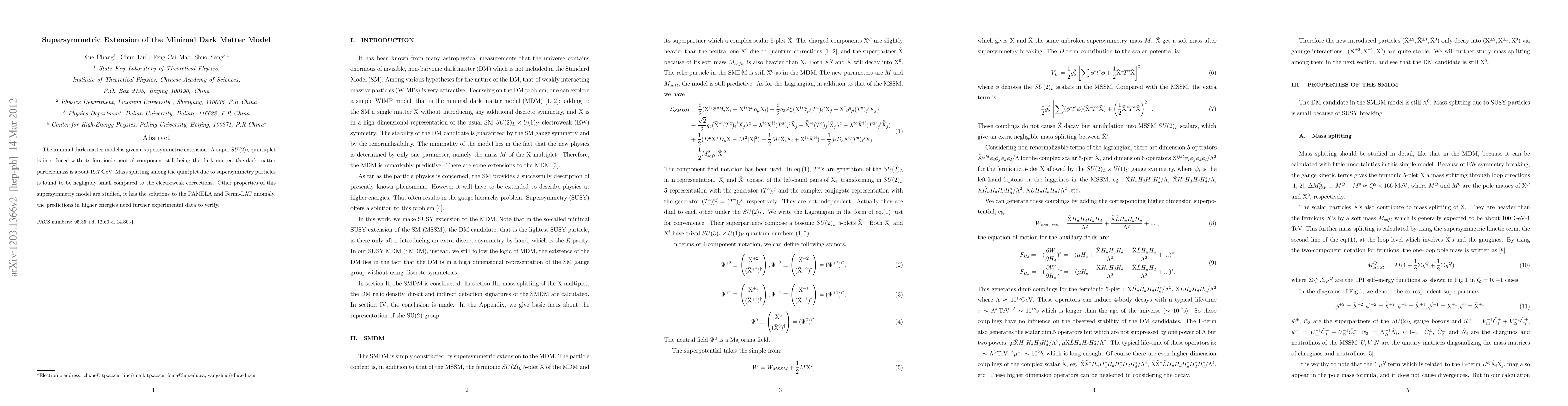 This paper proposes a supersymmetric extension of the minimal dark matter model, introducing a super SU(2)L quintuplet with a dark matter particle mass of 19.7 GeV, which could explain the PAMELA and Fermi-LAT anomaly.