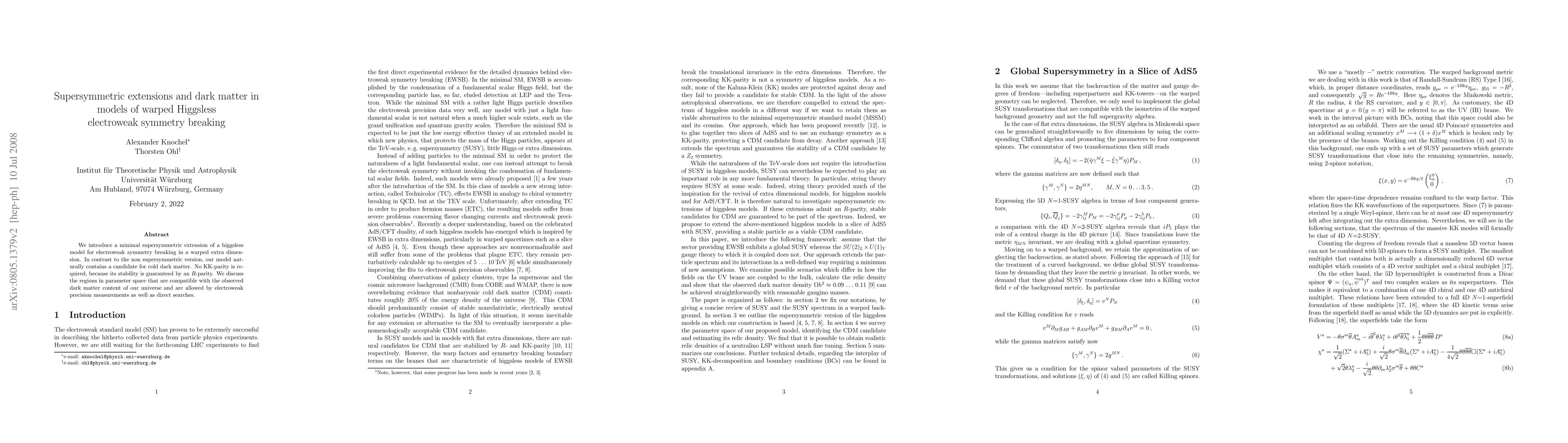 The paper presents a minimal supersymmetric extension of a warped higgsless EWSB model, incorporating R-parity to stabilize dark matter candidates and discussing parameter regions compatible with dark matter and experimental constraints.