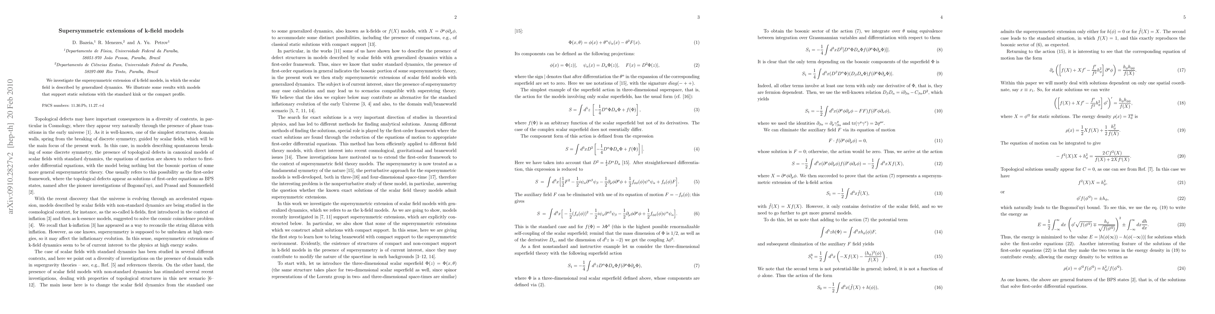We investigate the supersymmetric extension of k-field models, in which the scalar field is described by generalized dynamics. We illustrate some results with models that support static solutions with the standard kink or the compact profile.