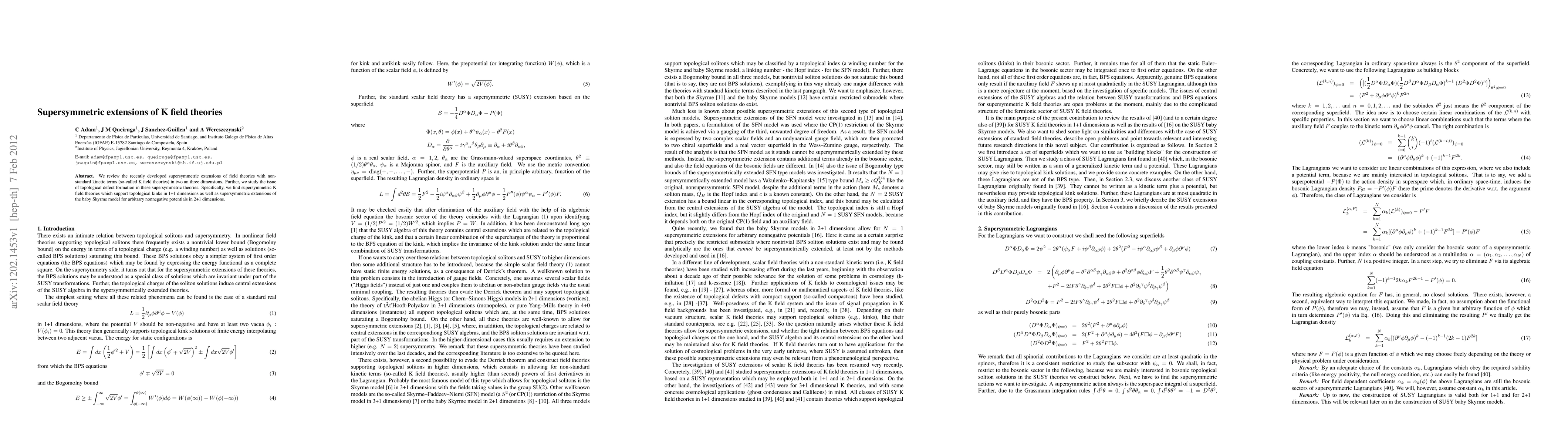 This paper reviews supersymmetric extensions of K field theories in 2D and 3D, focusing on topological defect formation. It identifies supersymmetric K field theories with topological kinks in 1+1 dimensions and extends the baby Skyrme model in 2+1 dimensions for arbitrary nonnegative potentials.