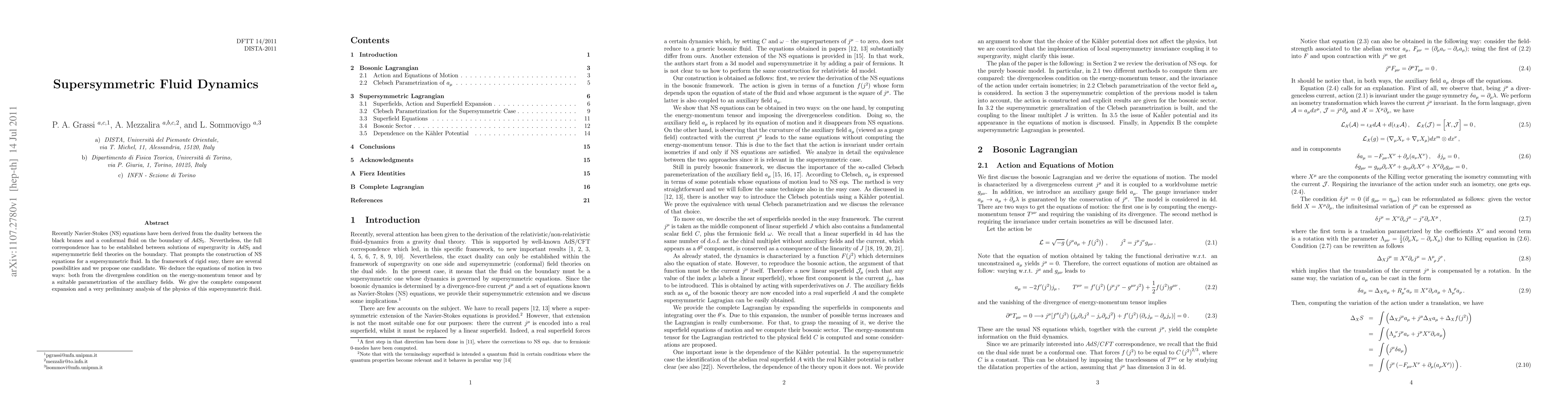 Recently Navier-Stokes (NS) equations have been derived from the duality between the black branes and a conformal fluid on the boundary of AdS_5. Nevertheless, the full correspondence has to be established between solutions of supergravity in AdS_5 and supersymmetric field theories on the boundary. That prompts the construction of NS equations for a supersymmetric fluid. In the framework of rigid susy, there are several possibilities and we propose one candidate. We deduce the equations of motion in two ways: both from the divergenless condition on the energy-momentum tensor and by a suitable parametrization of the auxiliary fields. We give the complete component expansion and a very preliminary analysis of the physics of this supersymmetric fluid.