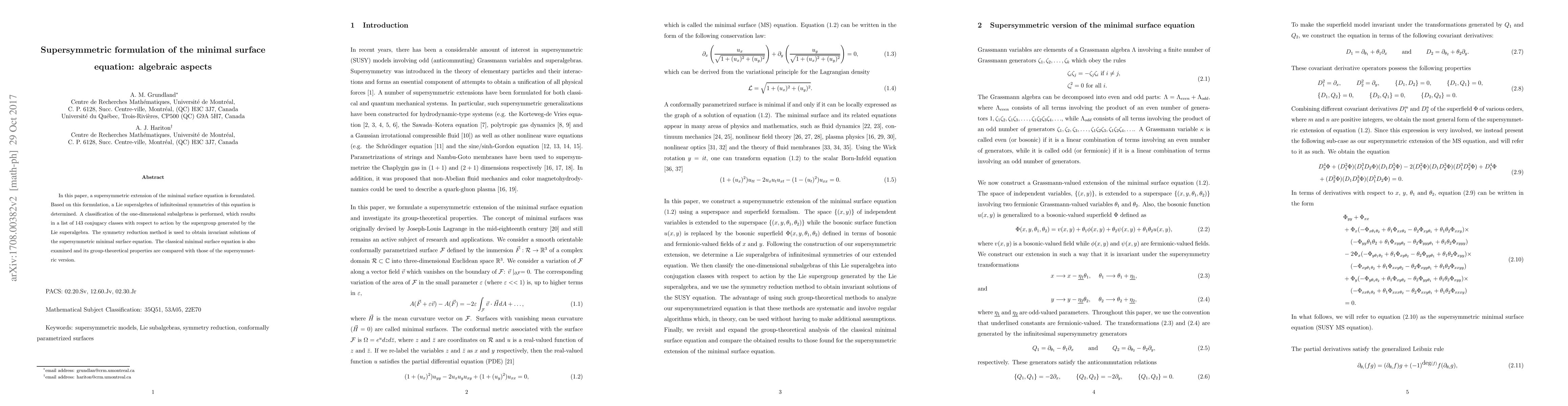 In this paper, a supersymmetric extension of the minimal surface equation is formulated. Based on this formulation, a Lie superalgebra of infinitesimal symmetries of this equation is determined. A classification of the one-dimensional subalgebras is performed, which results in a list of 143 conjugacy classes with respect to action by the supergroup generated by the Lie superalgebra. The symmetry reduction method is used to obtain invariant solutions of the supersymmetric minimal surface equation. The classical minimal surface equation is also examined and its group-theoretical properties are compared with those of the supersymmetric version.