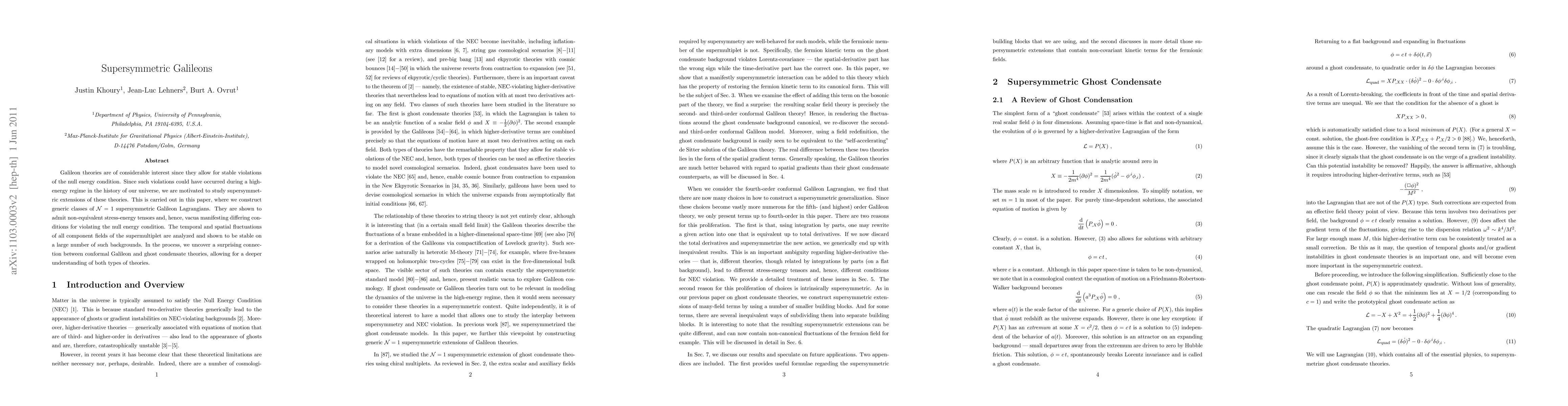 Galileon theories are of considerable interest since they allow for stable violations of the null energy condition. Since such violations could have occurred during a high-energy regime in the history of our universe, we are motivated to study supersymmetric extensions of these theories. This is carried out in this paper, where we construct generic classes of N=1 supersymmetric Galileon Lagrangians. They are shown to admit non-equivalent stress-energy tensors and, hence, vacua manifesting differing conditions for violating the null energy condition. The temporal and spatial fluctuations of all component fields of the supermultiplet are analyzed and shown to be stable on a large number of such backgrounds. In the process, we uncover a surprising connection between conformal Galileon and ghost condensate theories, allowing for a deeper understanding of both types of theories.