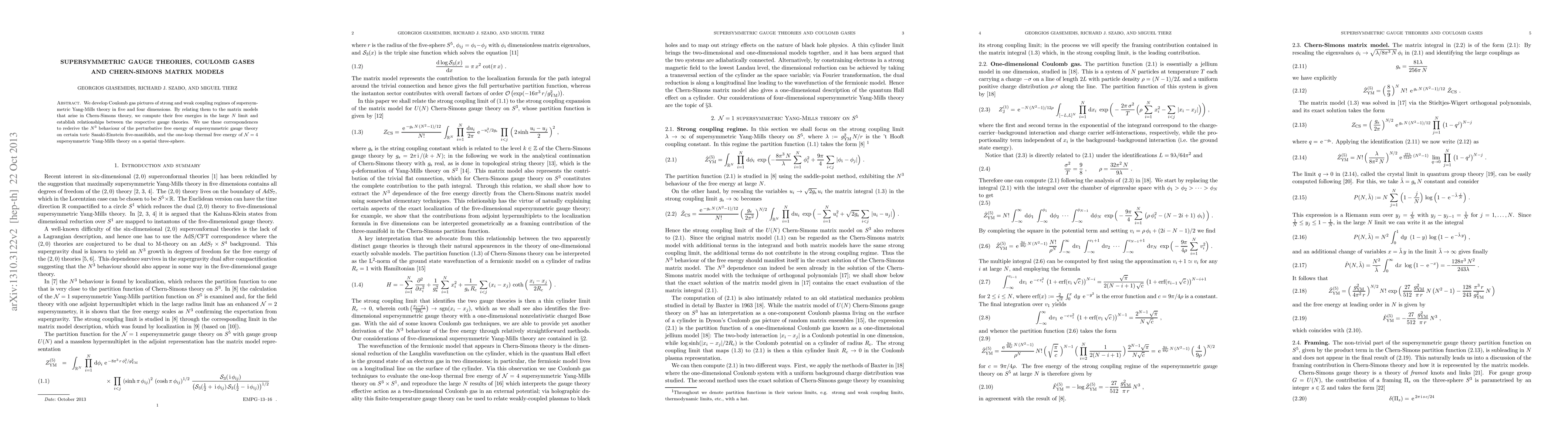 We develop Coulomb gas pictures of strong and weak coupling regimes of supersymmetric Yang-Mills theory in five and four dimensions. By relating them to the matrix models that arise in Chern-Simons theory, we compute their free energies in the large N limit and establish relationships between the respective gauge theories. We use these correspondences to rederive the N^3 behaviour of the perturbative free energy of supersymmetric gauge theory on certain toric Sasaki-Einstein five-manifolds, and the one-loop thermal free energy of N=4 supersymmetric Yang-Mills theory on a spatial three-sphere.